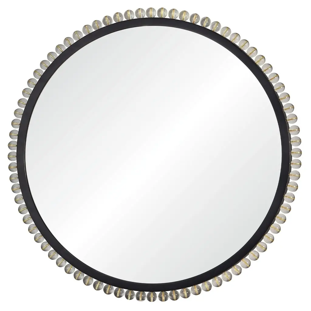 This uniquely-crafted mirror by Jamie Drake for Mirror Home will add high style to any space. Hand welded stainless steel frame finished in black or polished nickel and surrounded by acrylic spheres attached by brass hardware. Non-beveled center mirror. Cleat hardware provided. 36"W x 36"H Finish: Black Nickel or Poli