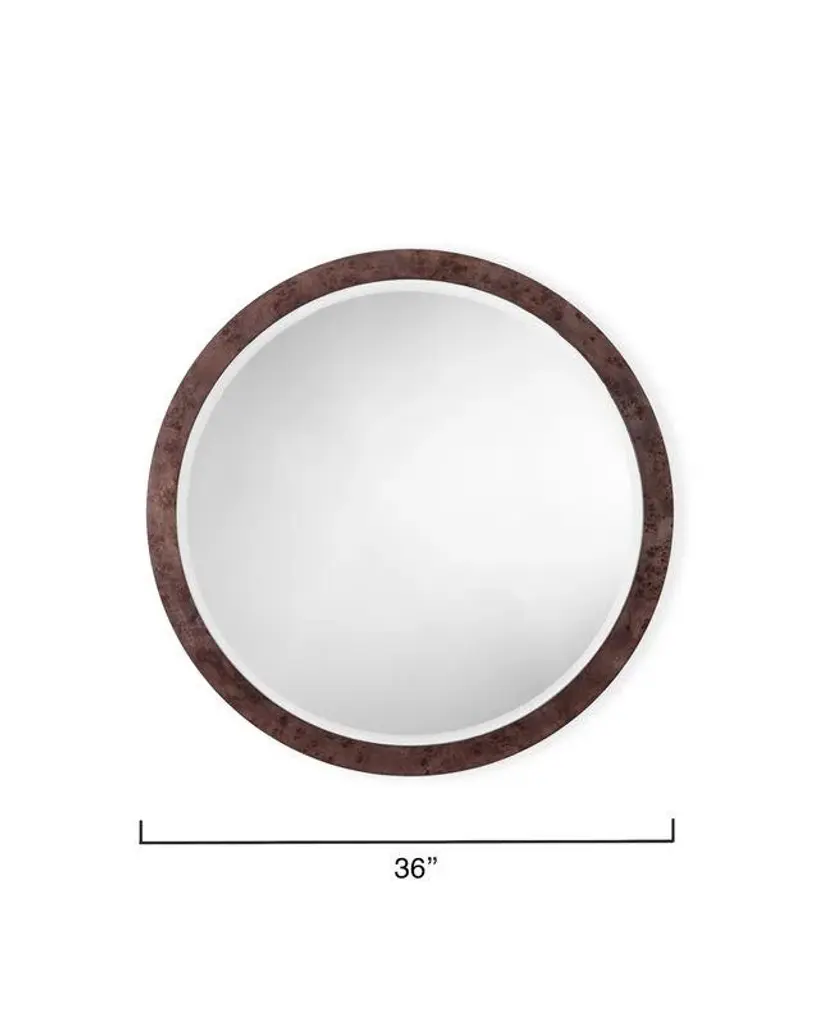 The classic lines of this wall mirror make it an easy addition to any room of the home, and the burnished beauty of its burl wood veneer frame makes it a spectacular one. With natural burl finishes, a beveled interior mirror, and a coordinating MDF back, these are the ideal choice to add an additional dimension to a gallery wall. Hand-made of Burl Wood Veneer Beveled Glass Mirror Hangs vertical only One-of-a-kind variations in tone and pattern Wall Mounted The handcrafted nature of this wood creates products with character and individuality. The inherent knots, grains, and variations in tone and texture, are preserved, to create pieces rich in detail and natural beauty. These unique imperfections and variations are what define our products, with each piece having its own personality. Mirror Surface: 32"H x 32"W D-Loop Hanging Mechanism Frame: 1.25" MDF Backing Care Instructions: Wipe frame with a soft, dry cloth. Wipe glass with standard glass cleaner. DO NOT use cleaners or abrasives on mirror frame.
