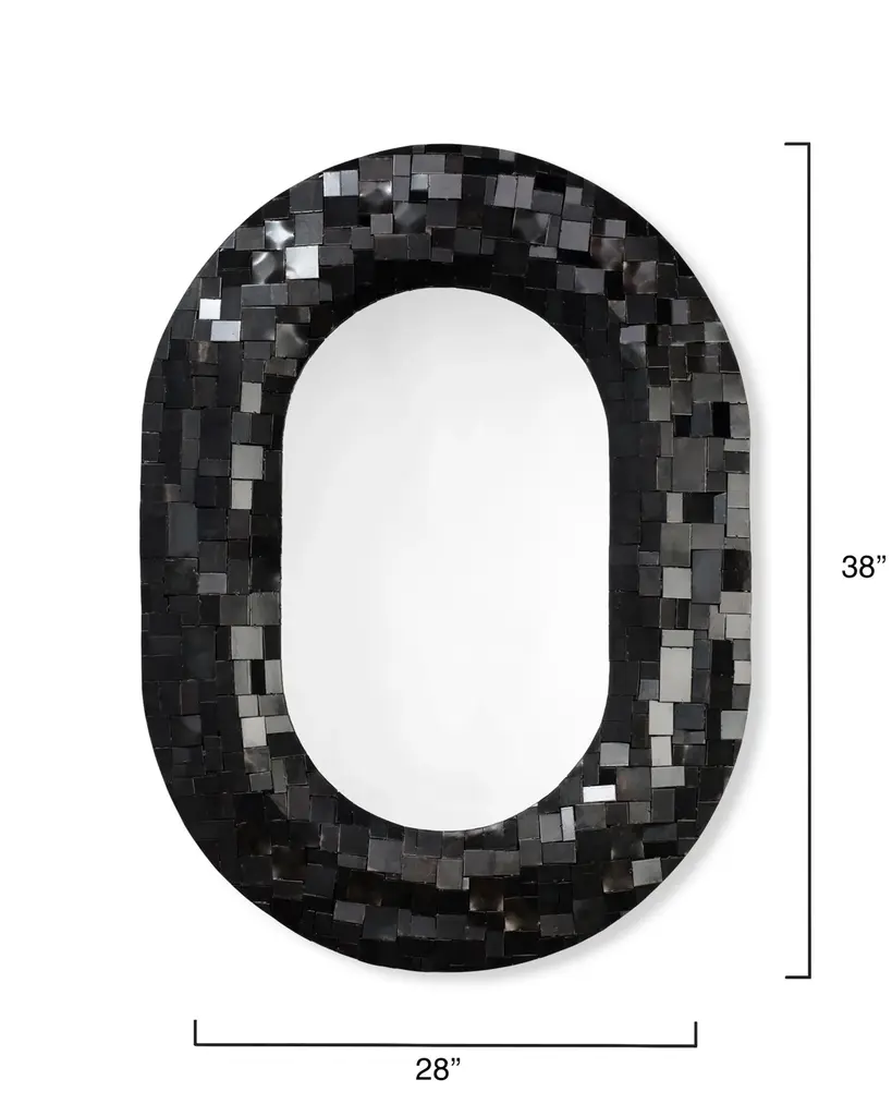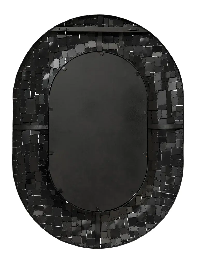 Edgy and industrial, and yet somehow also glitzy and glamorous, this fabulous design is created entirely of iron, with small squares and rectangles of minimally finished metal welded together to create a contemporary patchwork. No two will be identical. Hang this baby in your entry to check your crimson lips before you set out to slay. Hand-forged of Iron Non Beveled Glass Mirror Mirror can hang vertically only The inherent variations in tone and texture of metal are preserved, to create pieces rich in detail and natural beauty. These unique imperfections give our products character and individuality, with each piece having its own personality. These unique imperfections and variations are what define our products, with each piece having its own personality. Mirror Surface: 25"H x 14.96"W Sawtooth Hanging Mechanism Frame: 1.57" MDF Backing, Black Care Instructions: Wipe frame with a soft, dry cloth. Wipe glass with standard glass cleaner. DO NOT use cleaners or abrasives on mirror frame. Assembly Required? No