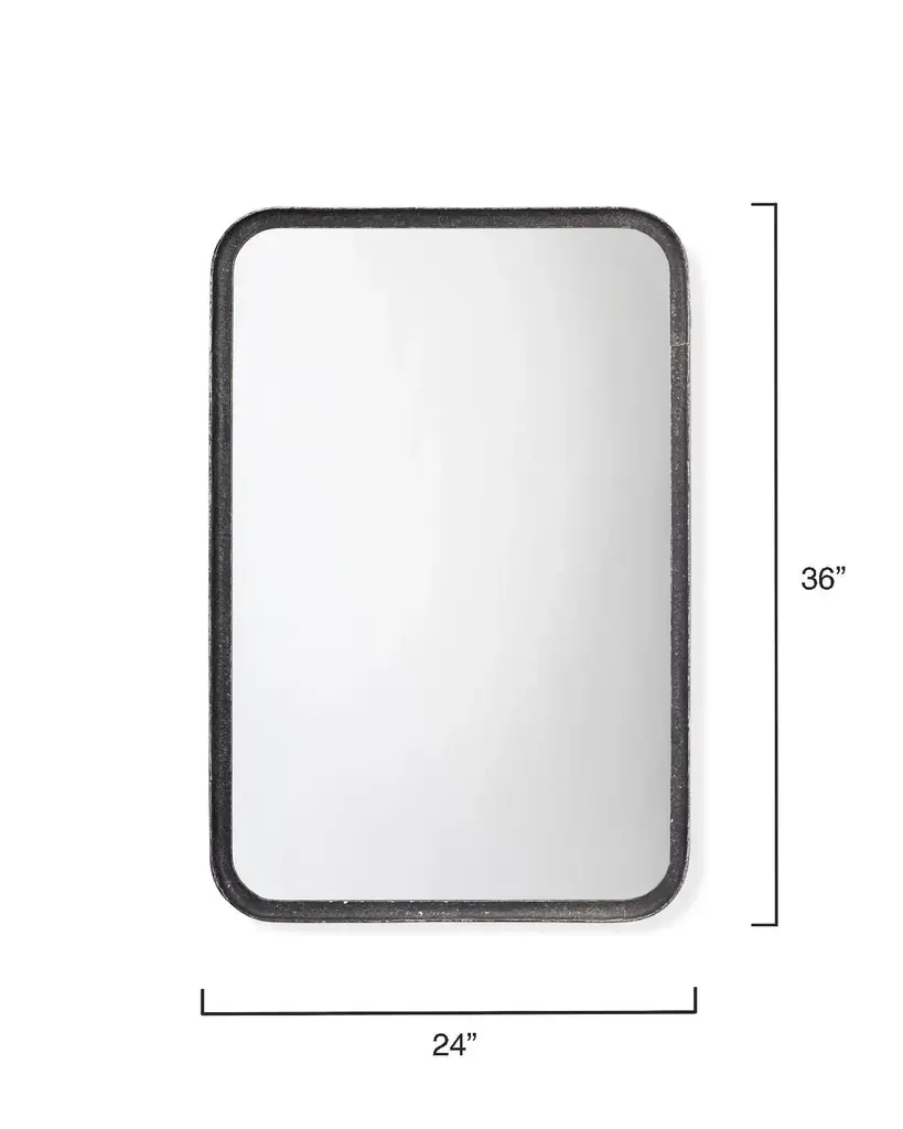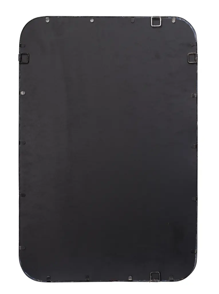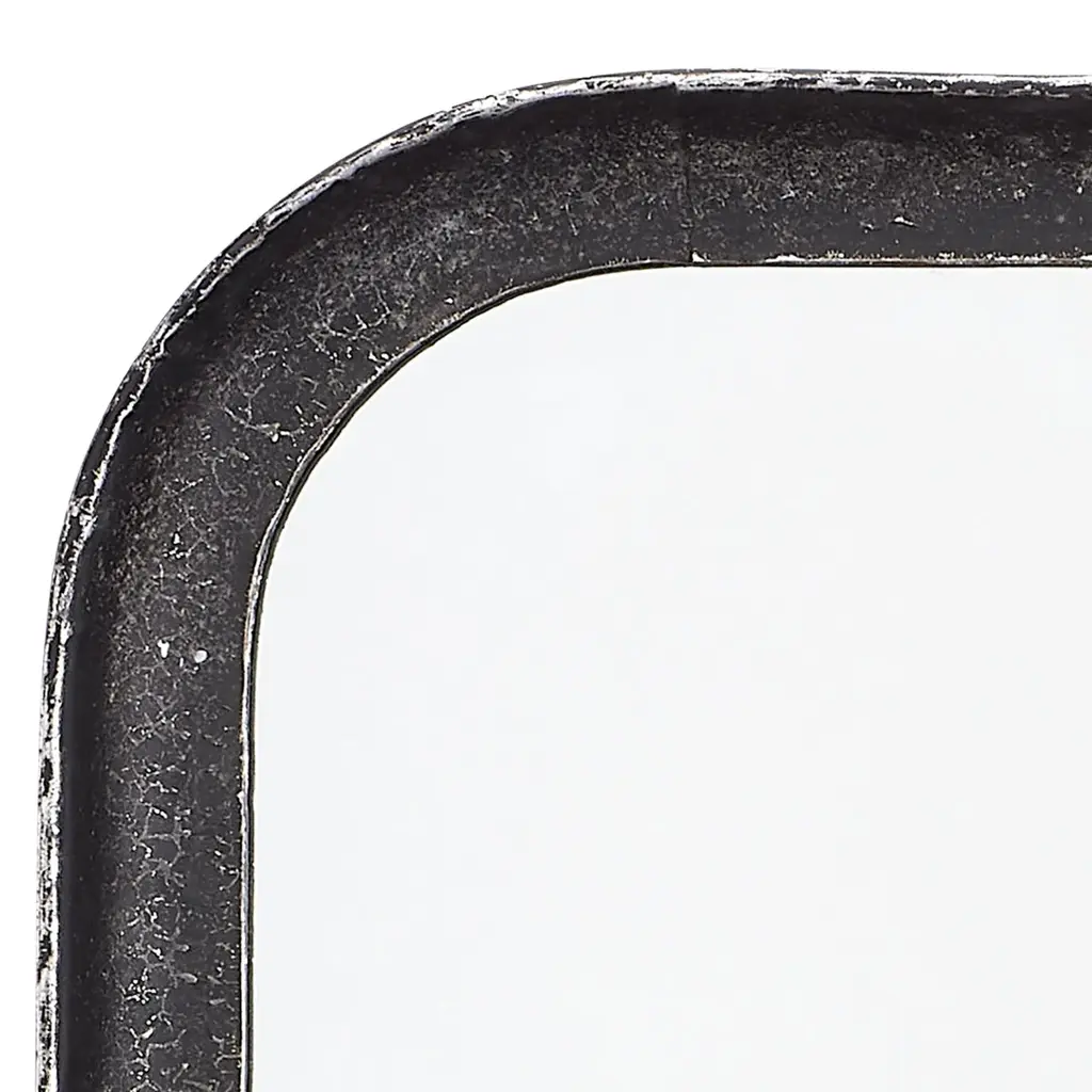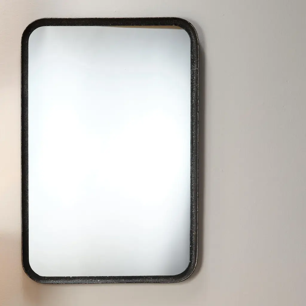 The clean lines of this contemporary wall mirror’s frame are forged of hand-distressed black metal. Featuring gently rounded corners that soften the starkness of the design without distracting and the versatility of hanging horizontally and vertically. Mounted above a vanity, sideboard or dresser, this mirror will open-up your view and make your space feel bigger. Expertly crafted of Iron and hand-distressed in Black Non beveled glass mirror Mirror can hang vertical or horizontal Rustic frame Mirror Surface: 33.75"H x 22"W D-Loop Hanging Mechanism Frame: 1"W MDF Backing