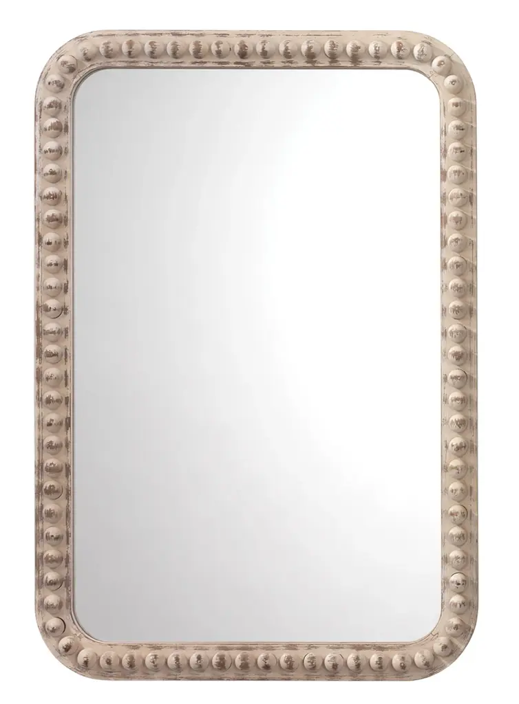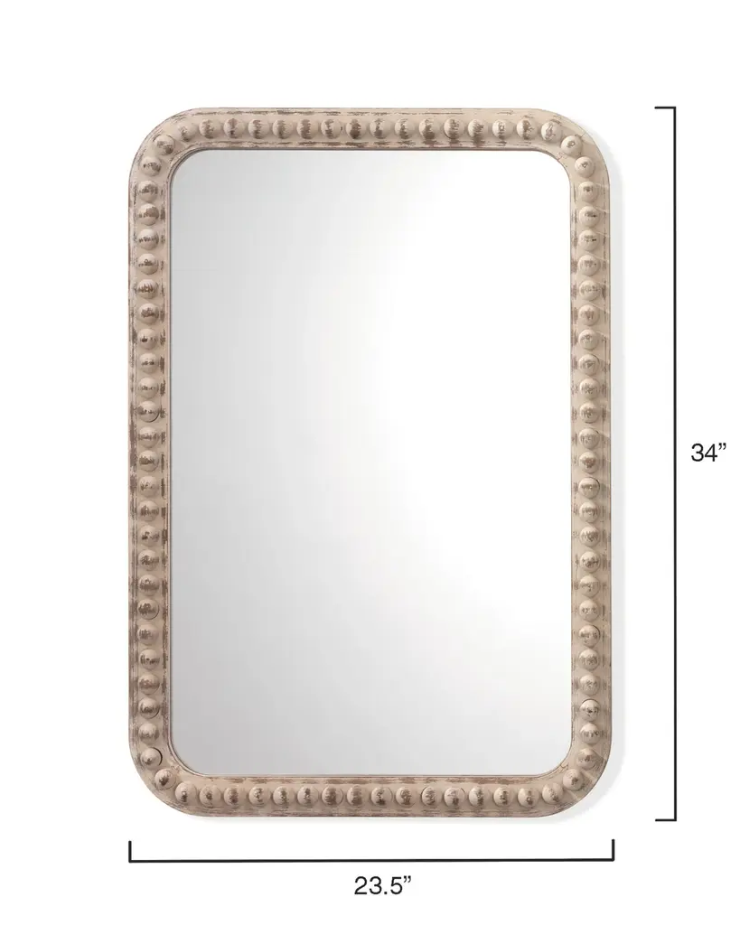 Our Audrey Mirror is classically simple with its delicate, rounded rectangle frame in a white washed wood finish. The slender frame has the additional detail of wood spheres around its perimeter. This light and airy mirror is the perfect addition to any guest room or bathroom. Expertly crafted of fir wood and white-washed Non beveled glass mirror Mirror can hang vertical or horizontal Rustic frame Mirror Surface: 30.25"H x 19.5"W D-Loop Hanging Mechanism Frame: 2"W MDF Backing