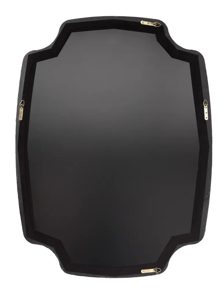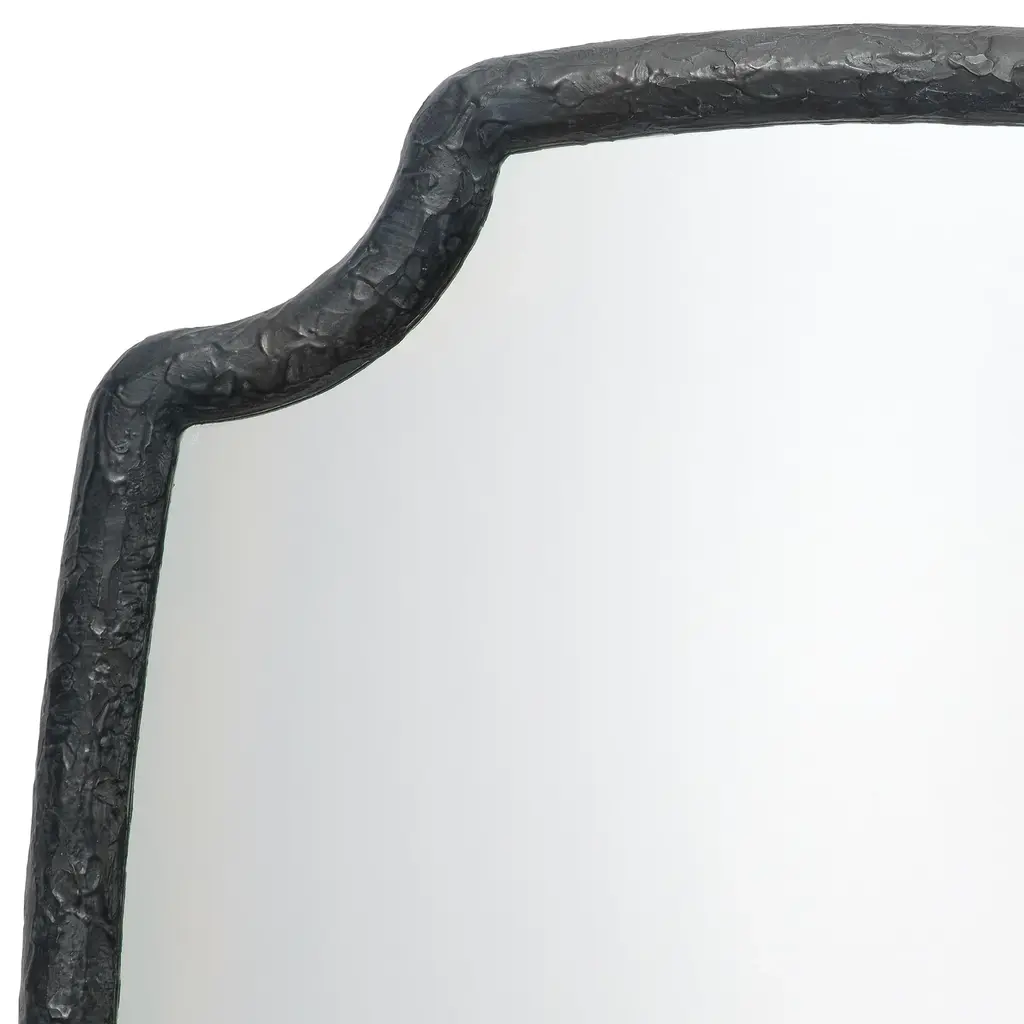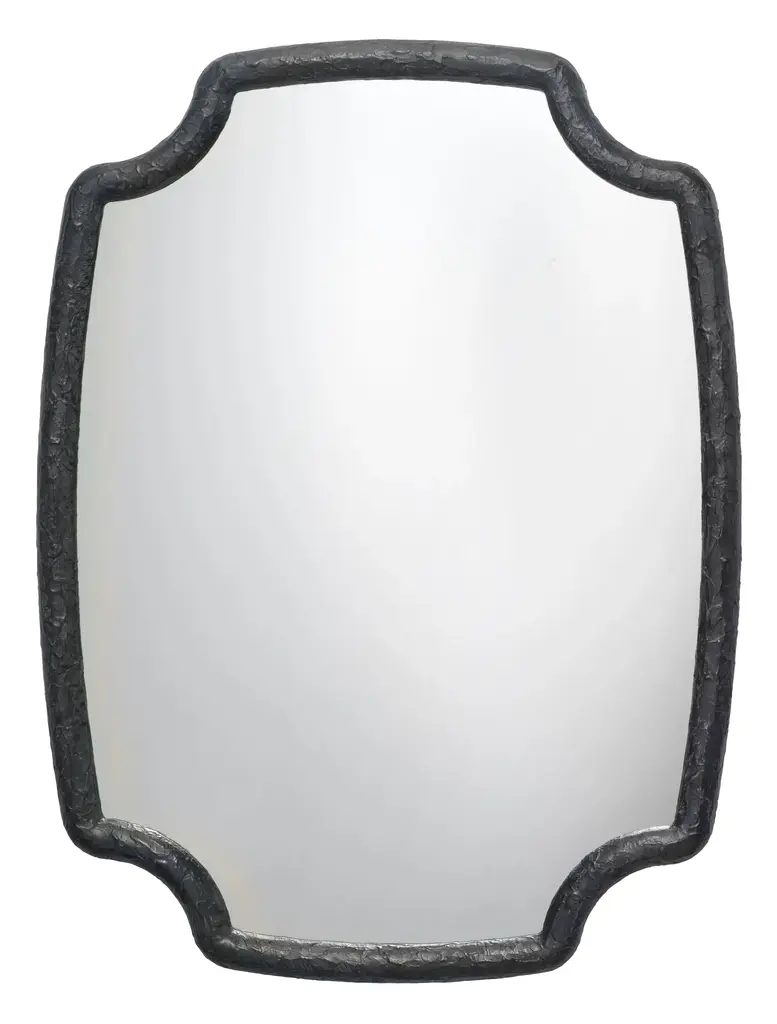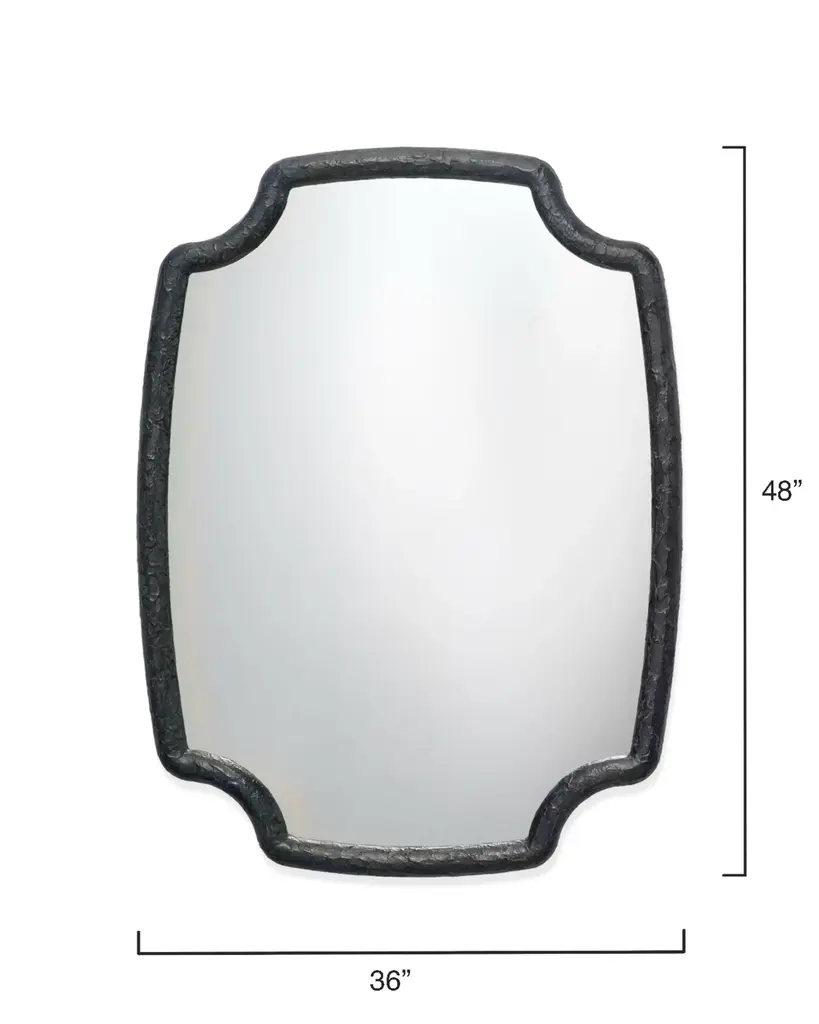 This large wall mirror is distinguished by its unique quatrefoil inspired shape and its richly textured resin frame. Simple and sleek, its deceptively simple designs makes it an ideal choice for upscale décors from urban loft to country casual. Crafted of Resin Non beveled glass mirror Mirror can hang vertical or horizontal Textured Finish Mirror Surface: 44"H x 32W" D-Loop Hanging Mechanism Frame: 2"W MDF Backing