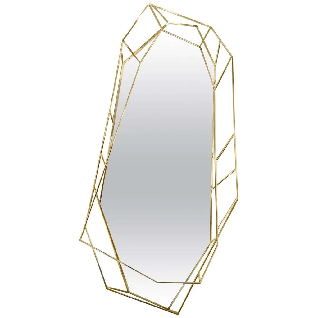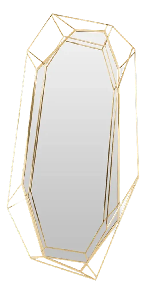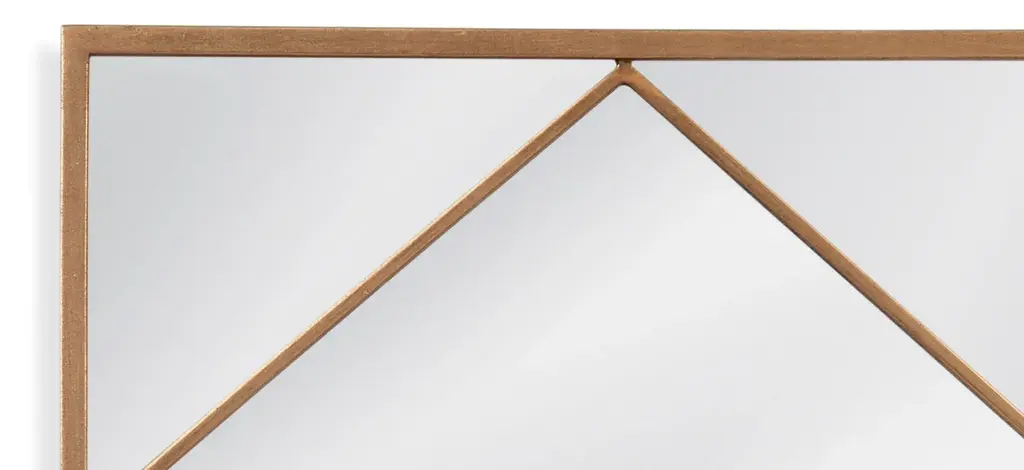 The Jase Wall Mirror features a thin metal frame finished in gold with gold triangular overlay design.
