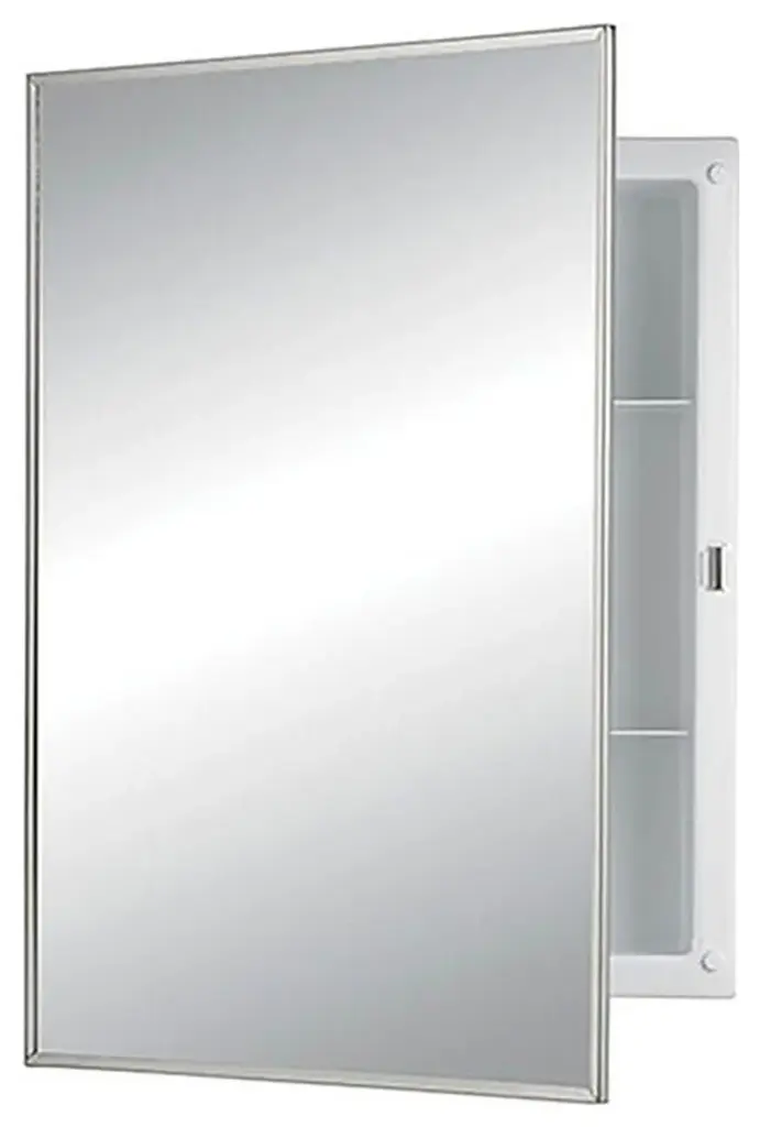 A simple solution for clearing clutter. Providing storage for the basic bath essentials, the Builder Series gets the job done with ease and simplicity. Its quality, polished edge mirror on the door lends a flawless reflection for years to come.Jensen Industries is a part of the Broan-NuTone Company, one of the leading providers of ventilation products for residential use. This recessed medicine cabinet has overall dimensions of 16 inches (width) x 22 inches (height) x 3-3/4 inches (depth). It readily comes with a fully assembled cabinet and a mounting hardware for quick installation.-Features• Recess mount ensures this cabinet will fit snugly into your wall, giving you full functionality with a low profile• Reversible for left-hand or right-hand door swing - door can be mounted with left or right hand opening for flexible installation options to suit your bathroom shape and size• Frameless, 1/2" glass mirror adds a classic look and a "sparkle" to the surroundings, blending effortlessly with any decor• Two fixed plastic shelves molded into cabinet housing (FX) provide secure storage for your bath essentials• Cabinet is fully assembled• Includes installation hardware• Magnetic catch in cabinet body flange aligns to stainless steel striker plate on the door• Recess-Mount Installation: Wall Opening/Rough-in Dimensions: 14" x 18" x 2-3/4"• Housing: PT01-Basic White• Weight: 6.5 lbs• Height: 22"• Width: 16"• Depth: 3-3/4"