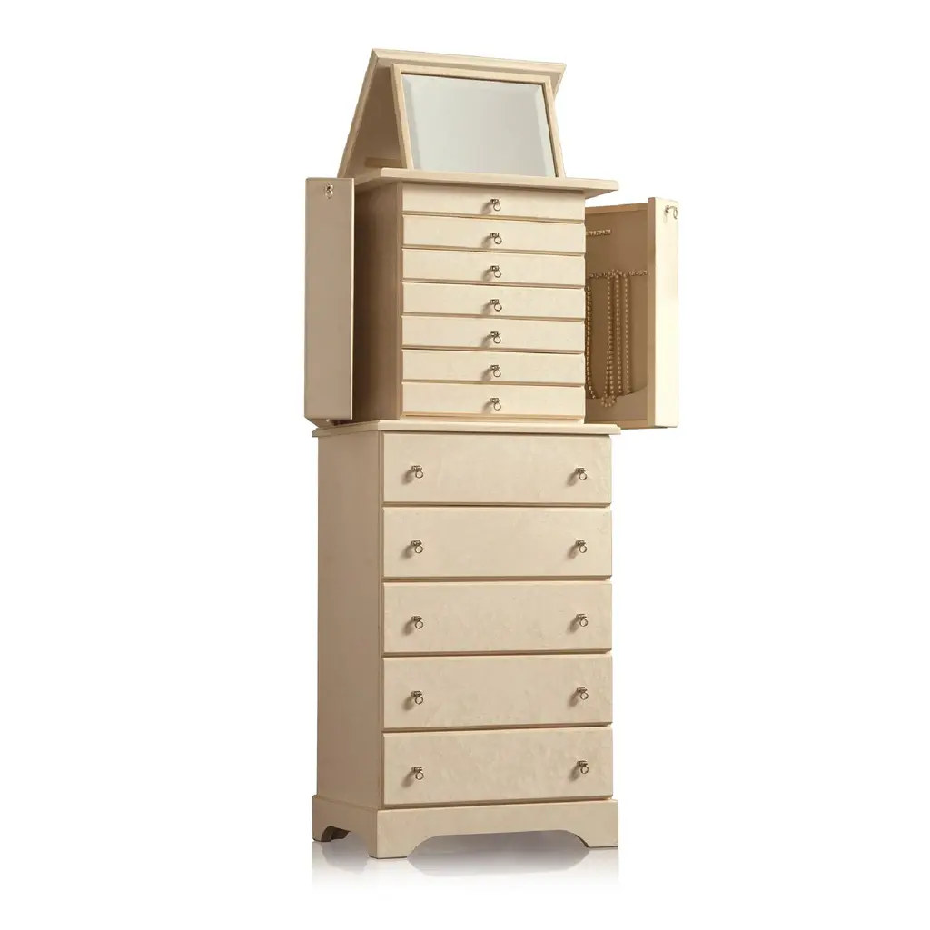 Since 1949, Agresti has crafted the pinnacle of luxury safes, trunks, and jewelry boxes in Florence, using only the finest materials, including full-grain leather, exotic woods, and textures like shagreen. As the premier name in high-end, custom solutions for safeguarding valuables, Agresti integrates cutting-edge security features: biometric access, secret compartments, unique keys, and hidden doorseverything you see in movies, they make real. Favored in multimillion-dollar estates, yachts, and private jets. Contact us to discover more about this exceptional product. Elevate your jewelry collection with the Agresti Lo Scrigno Jewelry Cabinet. Crafted in matte cream bird's eye maple with ultrasuede lining, this luxurious armoire features 24 karat gold plated brass accessories and lockable doors with necklace bars. The top section boasts an adjustable mirror, while the bottom drawers provide ample space for scarves, lingerie, and personal objects.