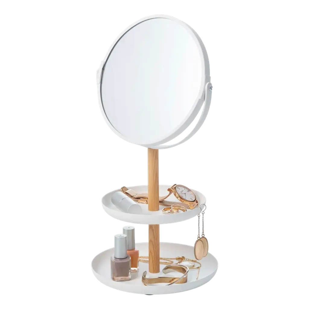 This stand is a stylish solution to display jewelry while adding a sophisticated accent to a dresser or vanity. Extending from a circular valet tray in leather-covered wood, the brass-finished slender metal pole features three lateral extensions to hang necklaces, bracelets, and rings and a round mirror. Available also with chrome or bronze finishes, please contact the Concierge.