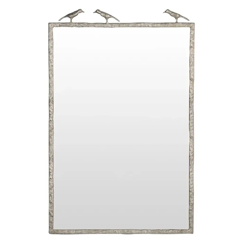 Calling all nature and bird lovers! Mimicking wood grain, the textured silver metal framed wall mirror features 3 sweet sparrows perched on top, adding a nature-inspired detail that will add light-hearted charm wherever mounted.