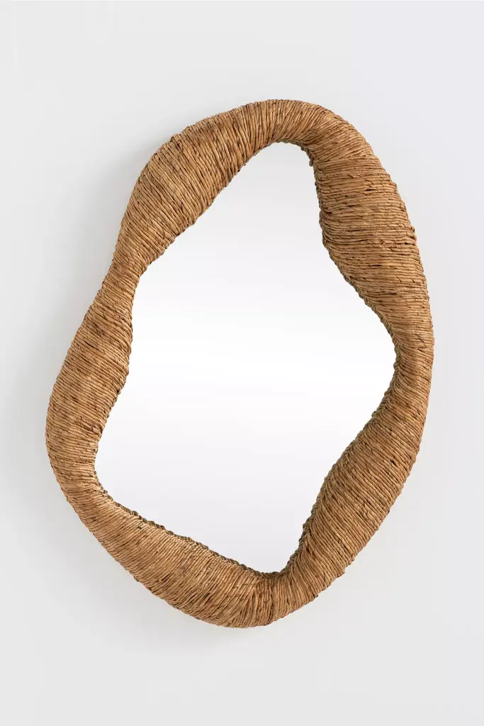 The Jolene Mirror features an undulating silhouette wrapped in natural rattan, bringing organic texture and sculptural elegance to any space.
