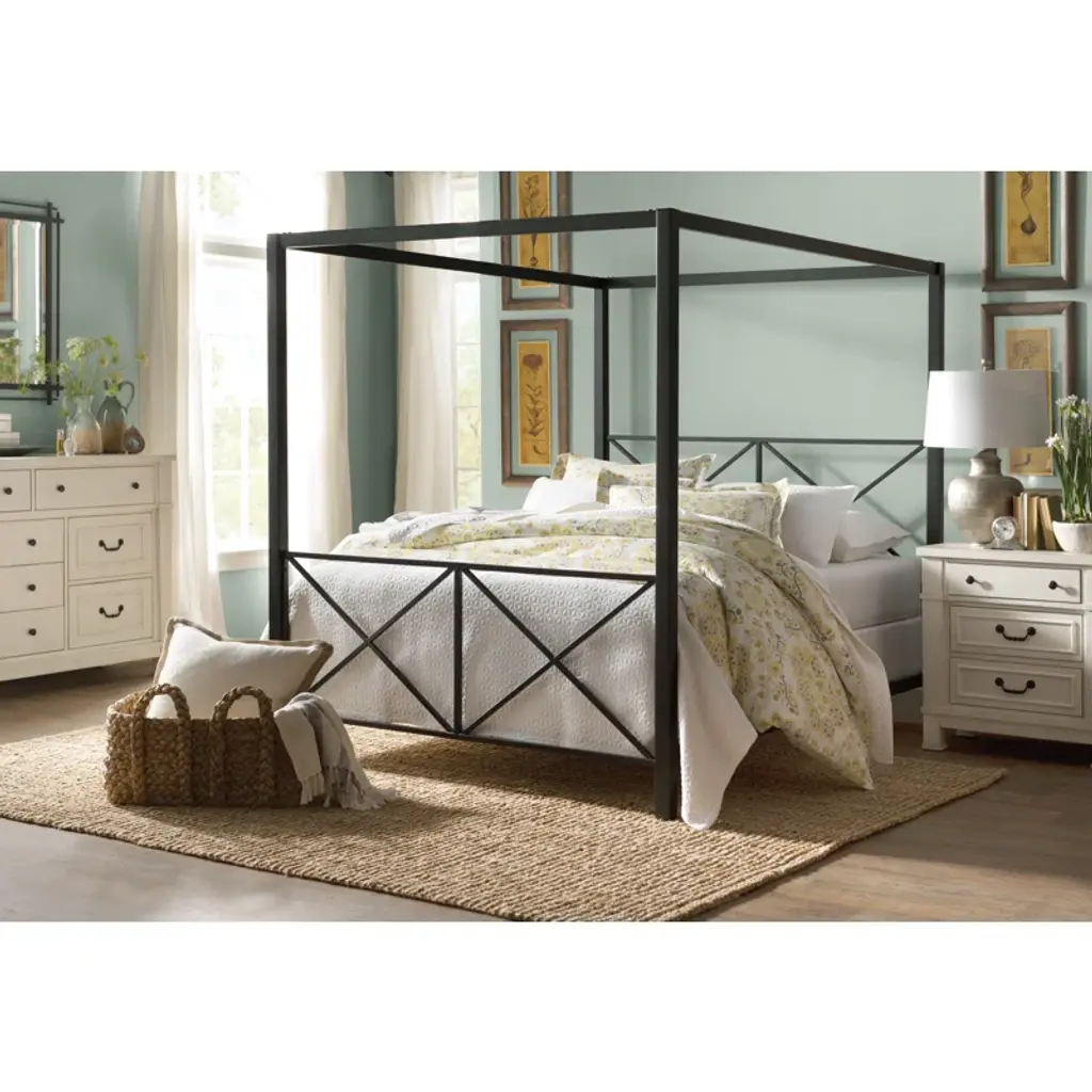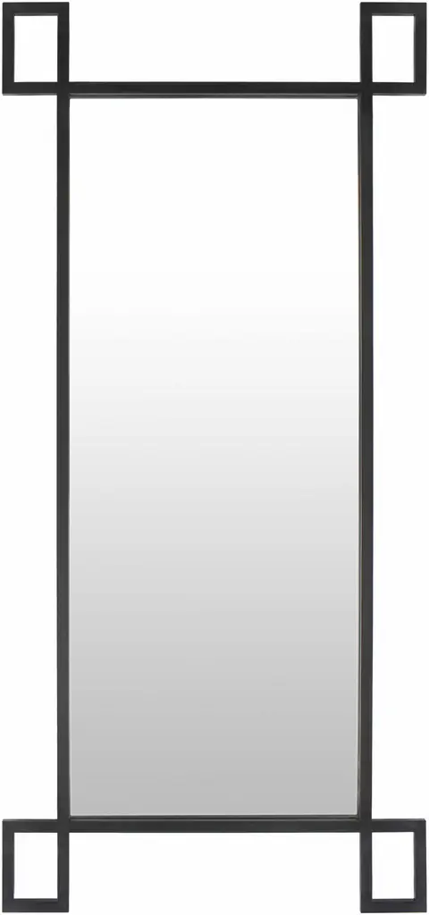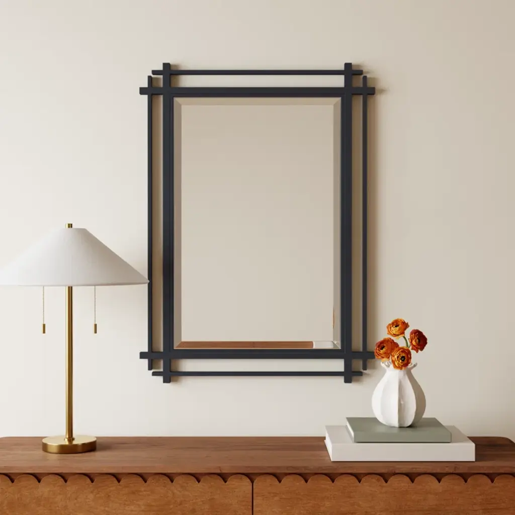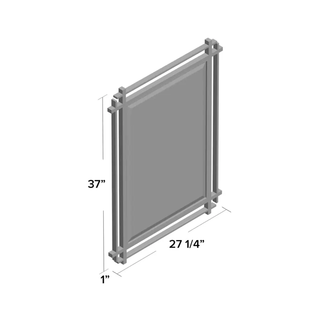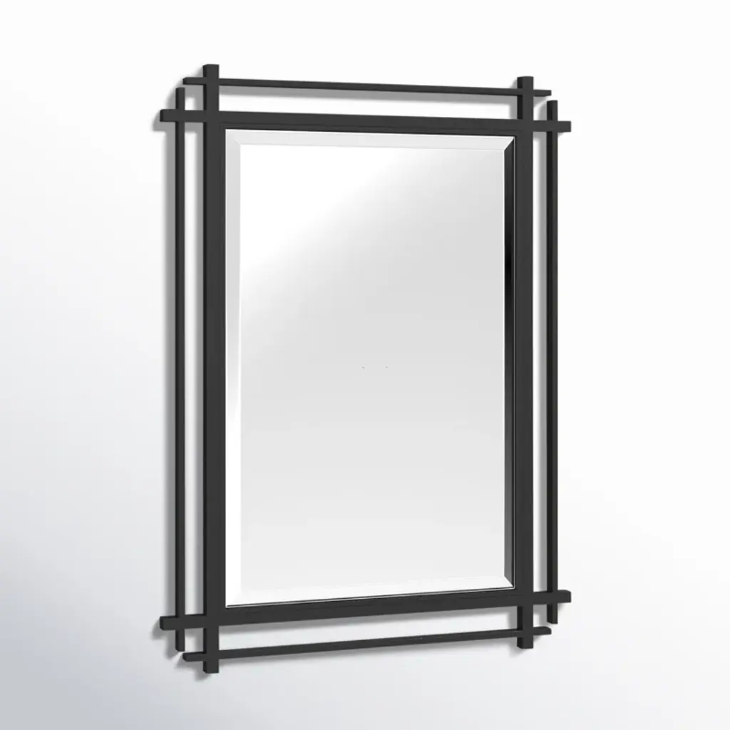 This accent mirror is just right for checking your look, as well as brightening up your living room, bedroom, or bathroom. Its beveled mirrored glass is framed with steel in an antiqued forged iron finish for a rustic feel. The design features two overlapping rectangles to create an openwork frame. You can hang this 37" by 27.25" mirror horizontally or vertically to best fit your space. Plus, we've included mounting hardware for easy hanging.