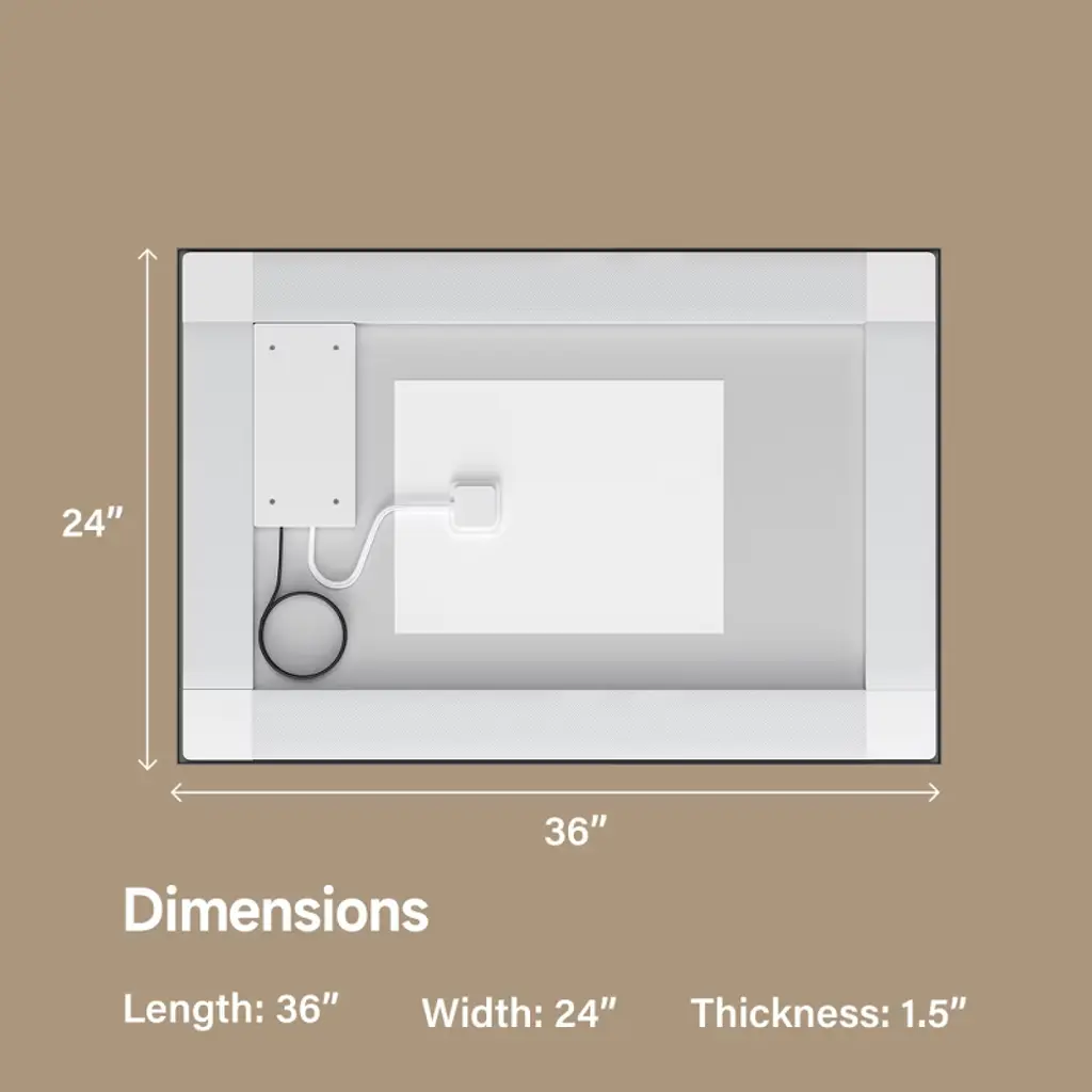 This modern bathroom mirror features a sleek black metal frame and dual light strips—front and back—for balanced, ambient illumination. Built with 4mm tempered, shatter-resistant glass, it ensures safety and long-lasting durability. The mirror offers three adjustable color temperatures and stepless dimming with a smart memory function that recalls your last settings. A built-in anti-fog function keeps the surface clear after hot showers, while the UL-certified ultra-slim 12V driver and included plug allow for easy, flexible installation in either horizontal or vertical orientation.