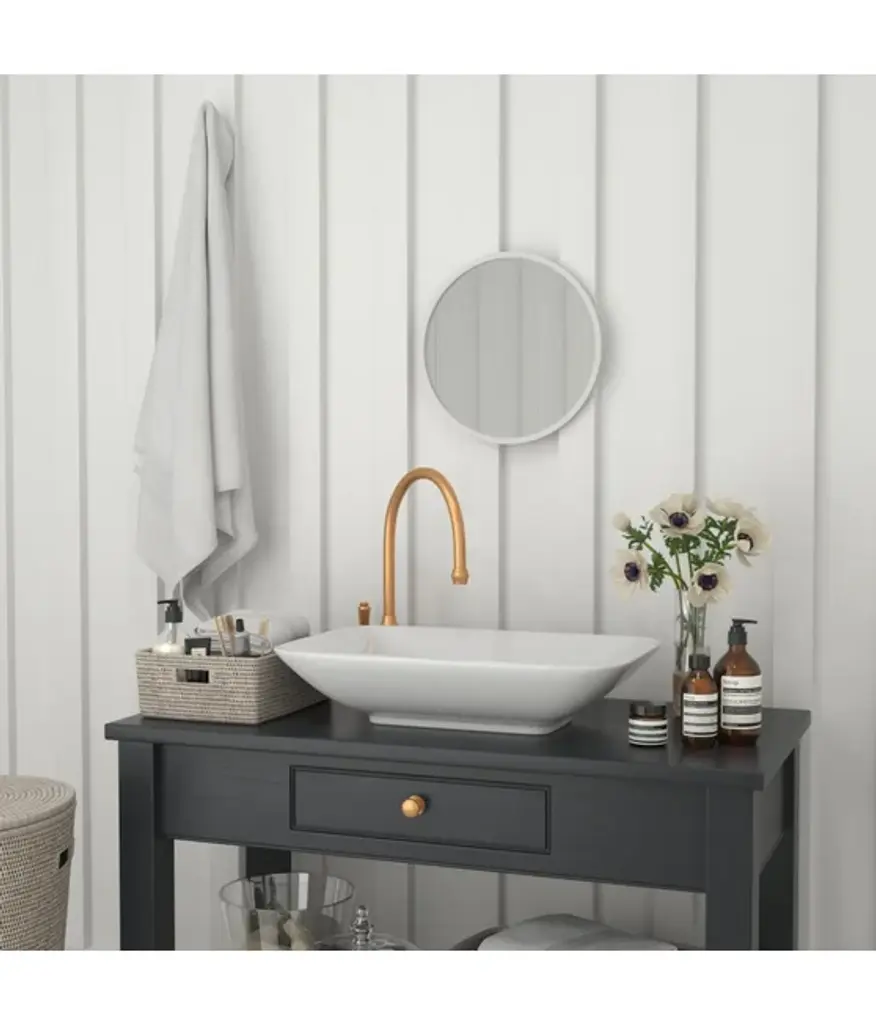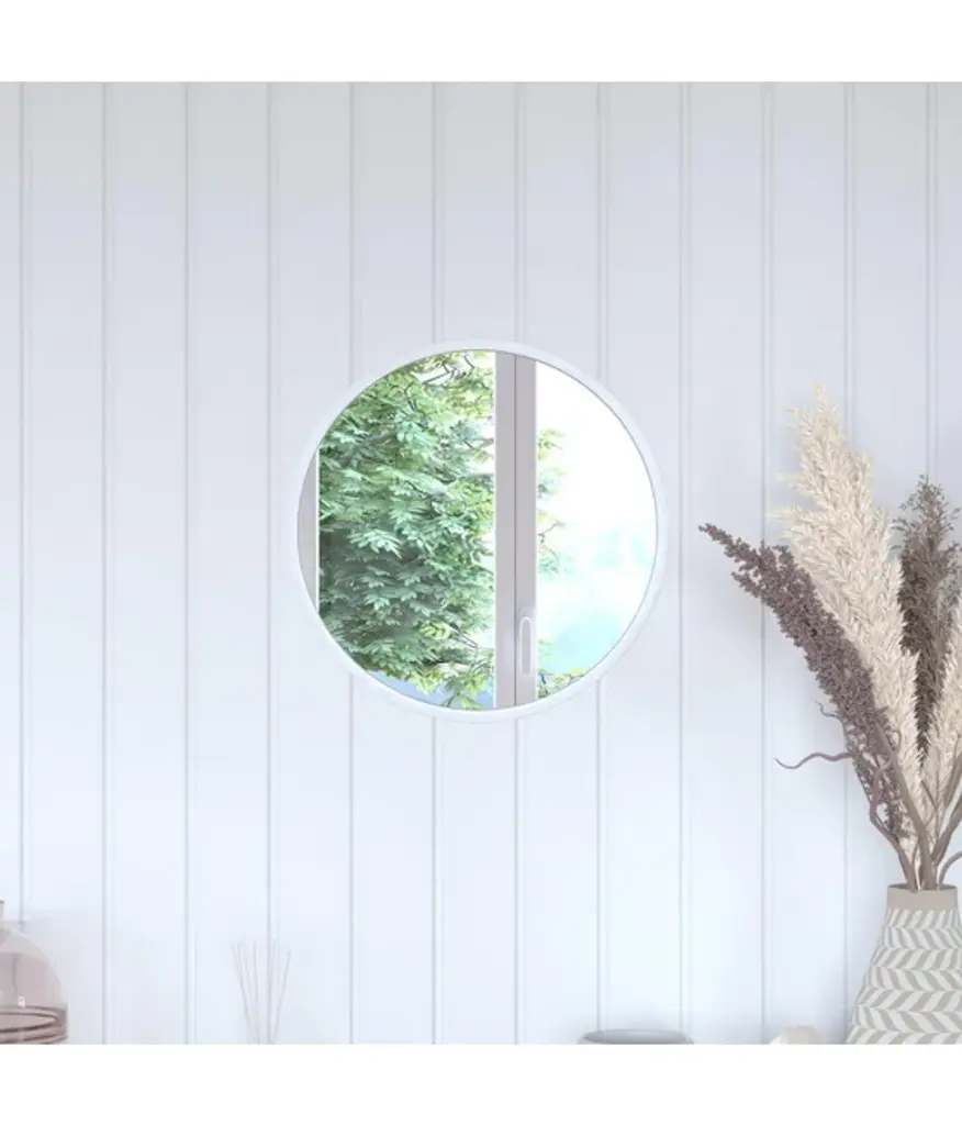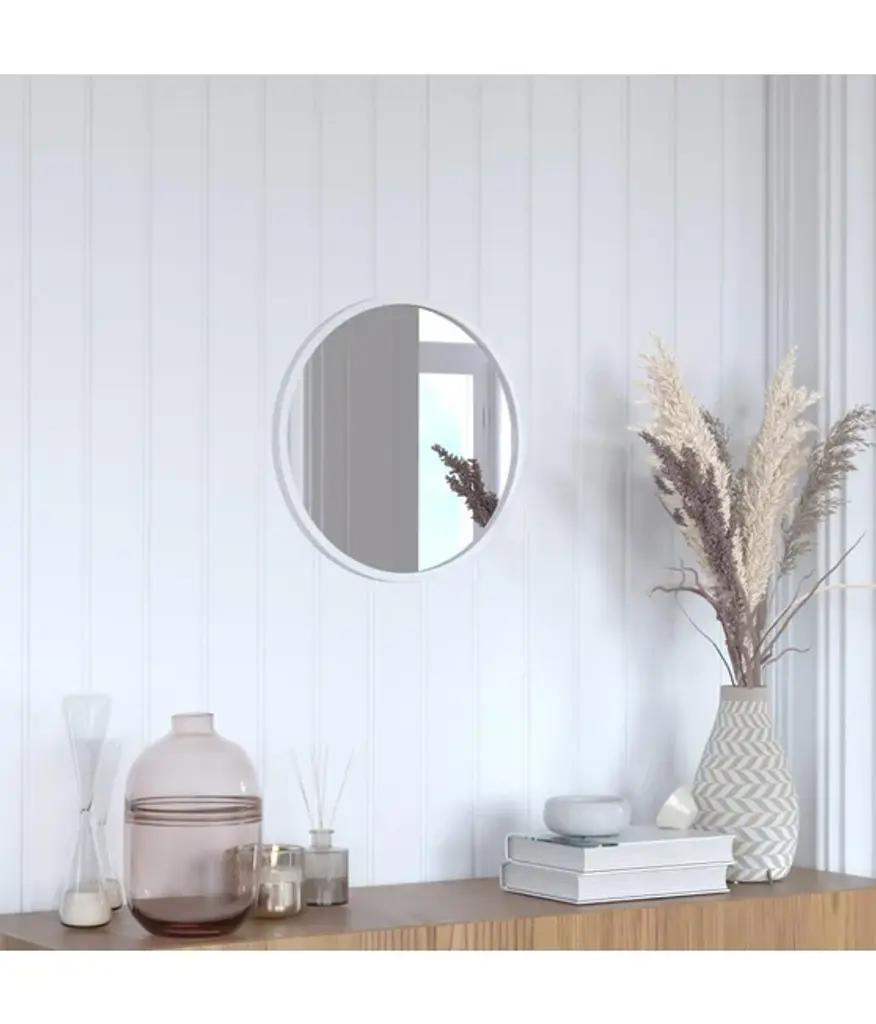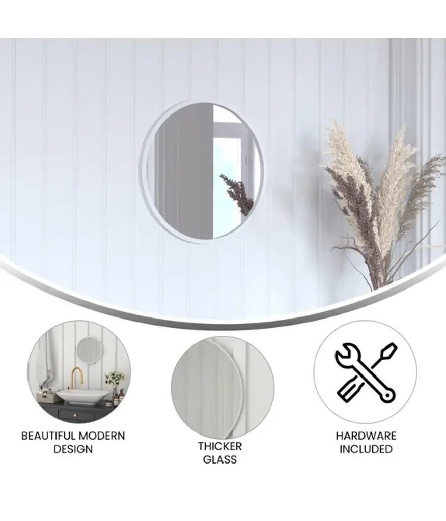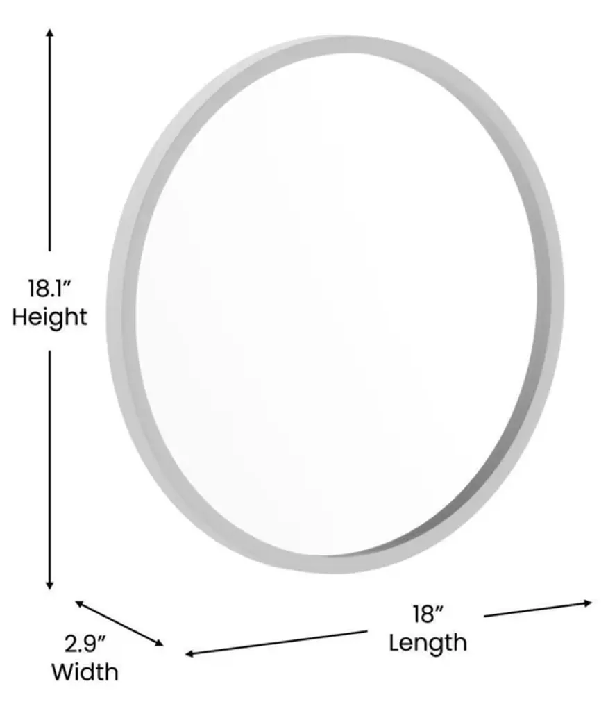 Give any room in your home an instant refresh with this round wall mount mirror. The modern design boasts a slim, matte black metal frame that lends an up-to-date look to almost any decor. HD glass with real silver backing provides high reflectivity for a distortion-free image. Safety should always be first, especially in environments with children and pets. Shatterproof backing technology ensures the glass stays put in the frame when breakage occurs to prevent cuts. The waterproof and rust-resistant design make this large mirror ideal for use in high humidity areas such as bathrooms, kitchens, and sheltered balconies. With three types of mounting hardware included installation of your new looking glass can begin as soon as you receive it and this mirror wipes clean with a damp cloth.Modern 16 Inch Round Wall Mount Accent MirrorSlim Silhouette Silver Metal FrameFrame Thickness 0.78"Real Silver Backed HD GlassShatterproof Backing for Safety3 Types of Mounting Hardware IncludedWall mount mirror for use as a vanity, accent, entryway, or bathroom mirrorSingle Unit Weight: 5.5 lbsItem Width: 16 InchesItem Depth: 0.78 InchesItem Height: 16 Inches
