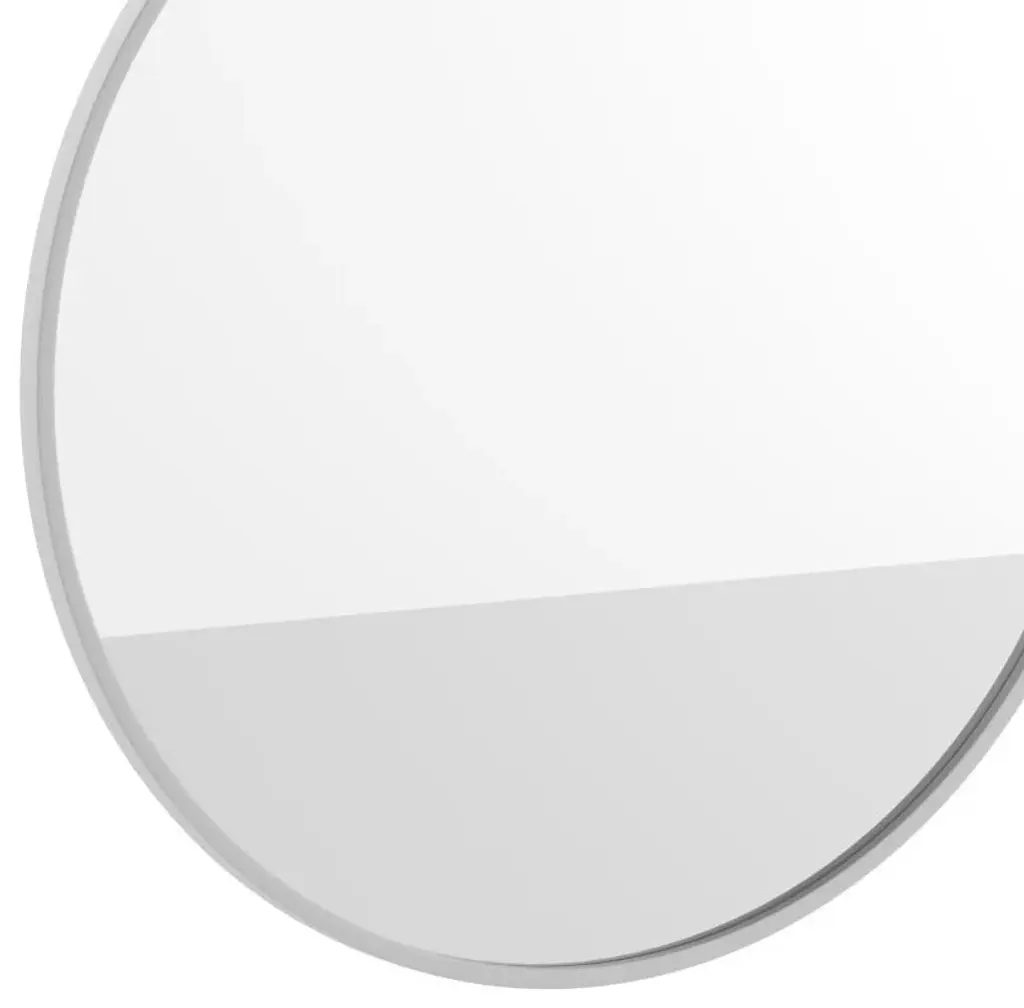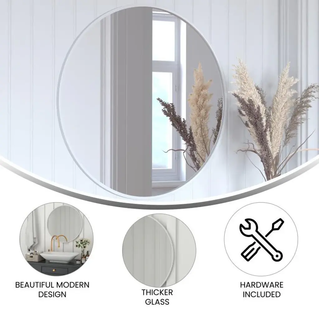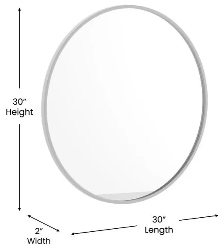 • Give any room in your home an instant refresh with this round wall mount mirror. The modern design boasts a slim, matte black metal frame that lends an up-to-date look to almost any decor. HD glass with real silver backing provides high reflectivity for a distortion-free image. Safety should always be first, especially in environments with children and pets. Shatterproof backing technology ensures the glass stays put in the frame when breakage occurs to prevent cuts. The waterproof and rust-resistant design make this large mirror ideal for use in high humidity areas such as bathrooms, kitchens, and sheltered balconies. With three types of mounting hardware included installation of your new looking glass can begin as soon as you receive it and this mirror wipes clean with a damp cloth.• Modern 30 Inch Round Wall Mount Accent Mirror• Slim Silhouette Silver Metal Frame• Frame Thickness 0.78"• Real Silver Backed HD Glass• Shatterproof Backing for Safety• 3 Types of Mounting Hardware Included• Wall mount mirror for use as a vanity, accent, entryway, or bathroom mirror• Single Unit Weight: 18.92 lbs• Item Width: 30 Inches• Item Depth: 0.78 Inches• Item Height: 30 Inches