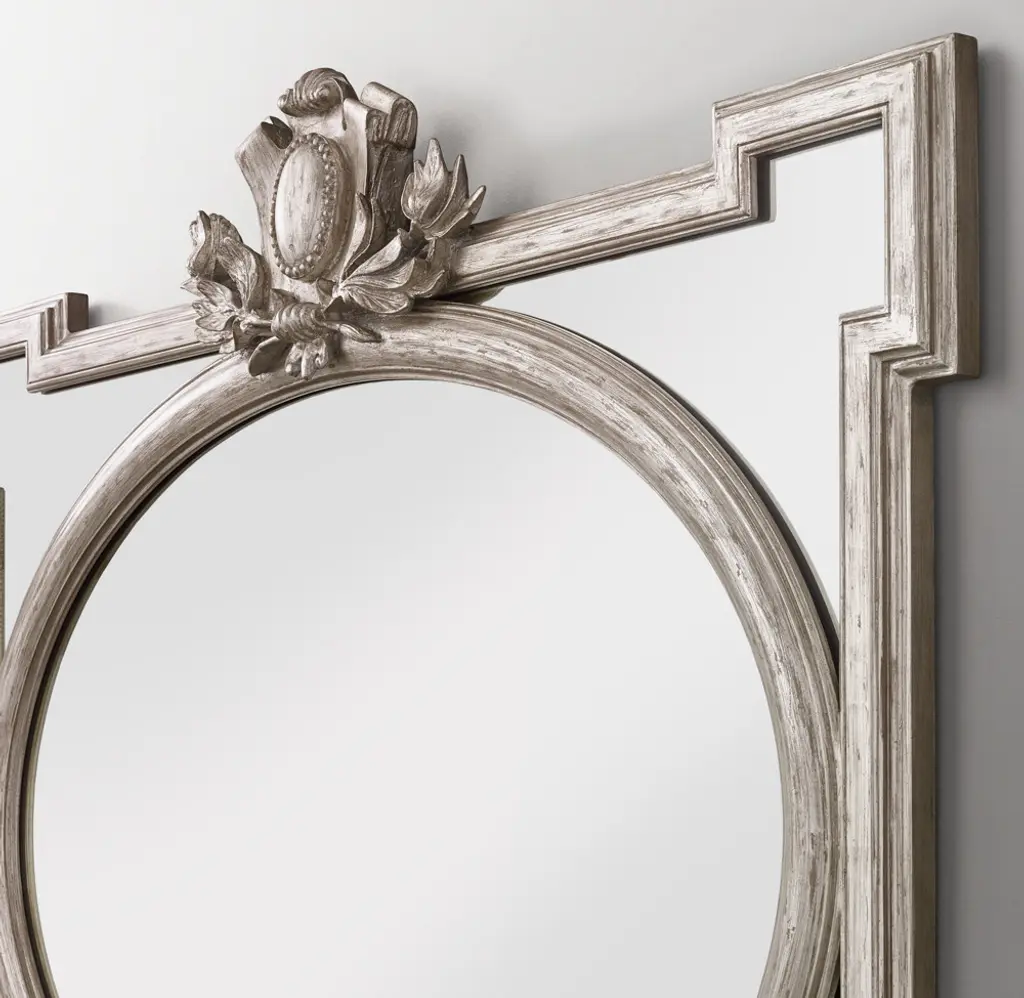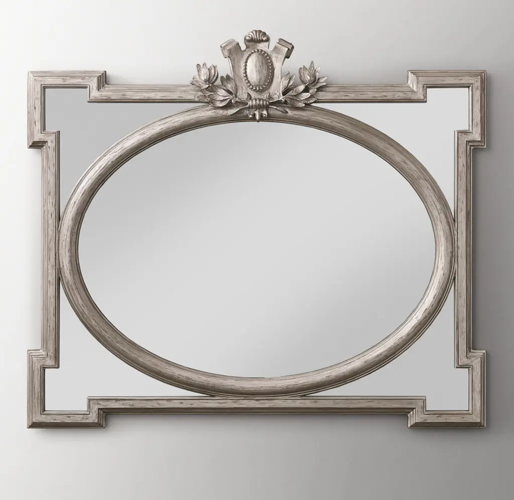 Inspired by French design, our grand oval mirror rests within a notched rectangular frame and is adorned with carved ornamentation.