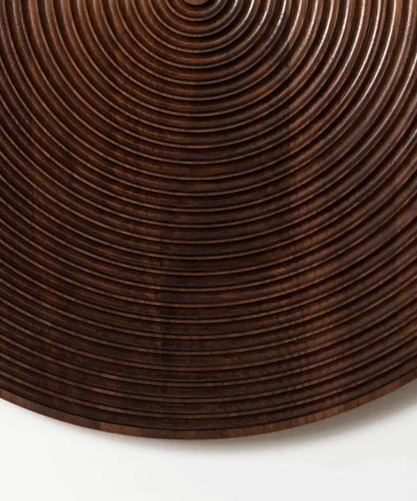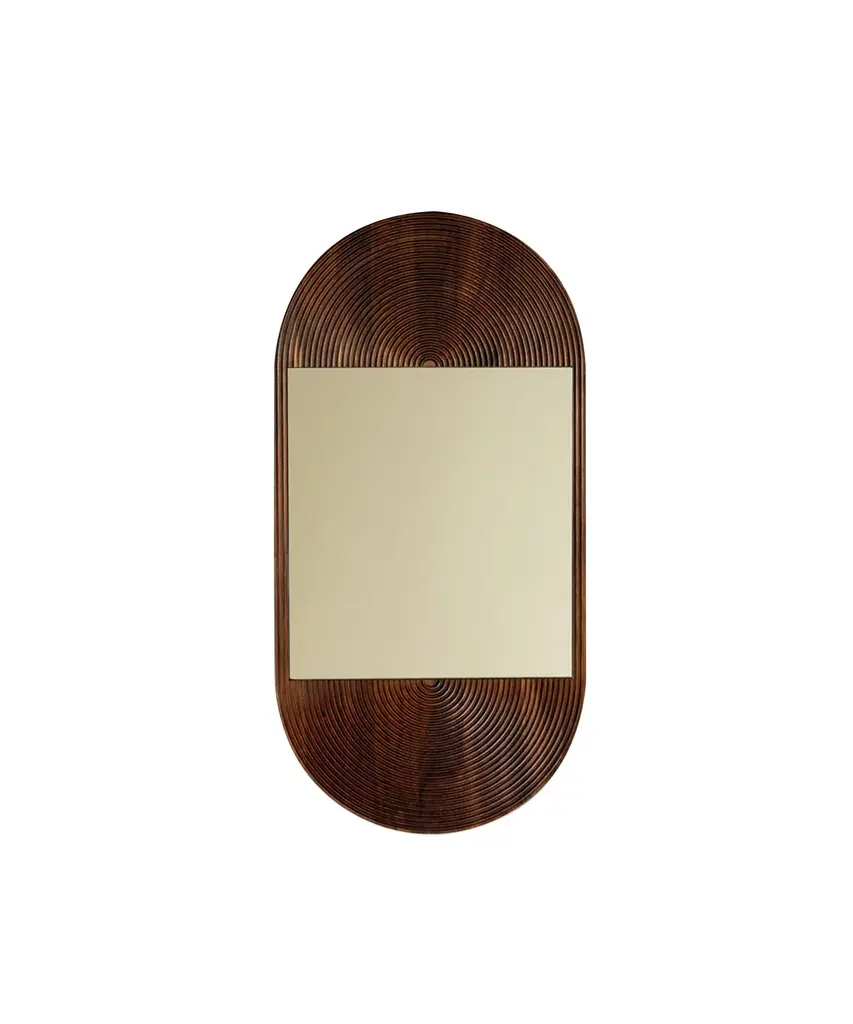 Concentric circles carved into the walnut wood of the June Mirror create a stunning sculptural pattern both modern and reminiscent of glamorous 1970s decor. The rounded carving of the June Mirror creates wave-like patterning in the deep, textured grain. This mirror mounts both vertically and horizontally and is available in multiple sizes. Each piece is designed and hand-produced by Coil + Drift, a lauded New York's Catskill Mountains-based design studio known for its vividly three-dimensional and material-forward collections.
