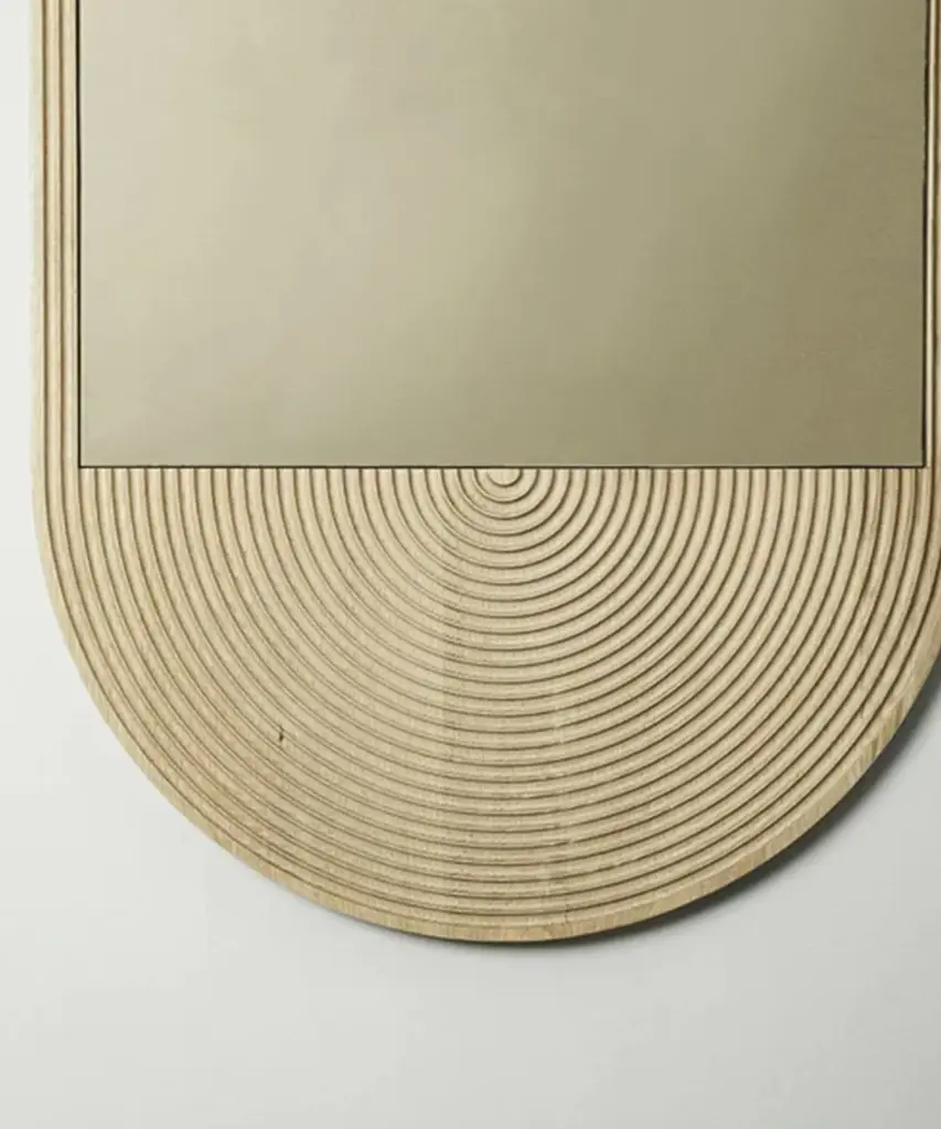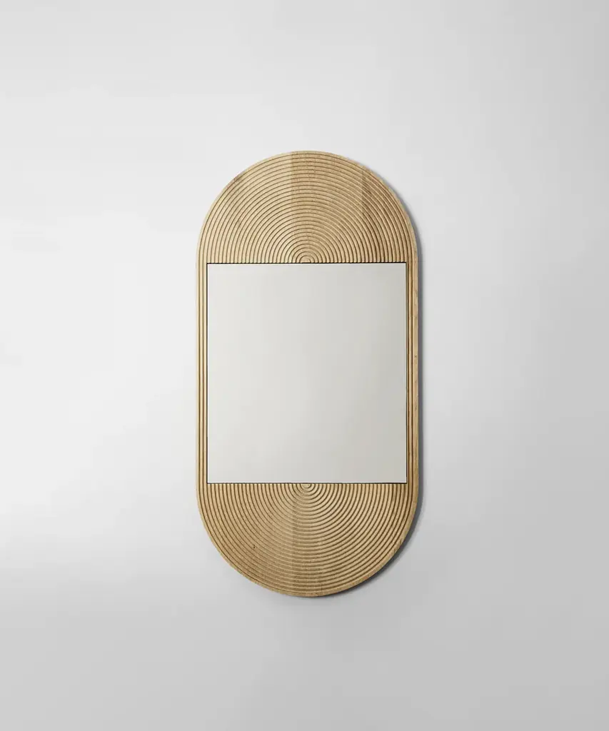 Concentric circles carved into the walnut wood of the June Mirror create a stunning sculptural pattern both modern and reminiscent of glamorous 1970s decor. The rounded carving of the June Mirror creates wave-like patterning in the deep, textured grain. This mirror mounts both vertically and horizontally and is available in multiple sizes. Each piece is designed and hand-produced by Coil + Drift, a lauded New York's Catskill Mountains-based design studio known for its vividly three-dimensional and material-forward collections.