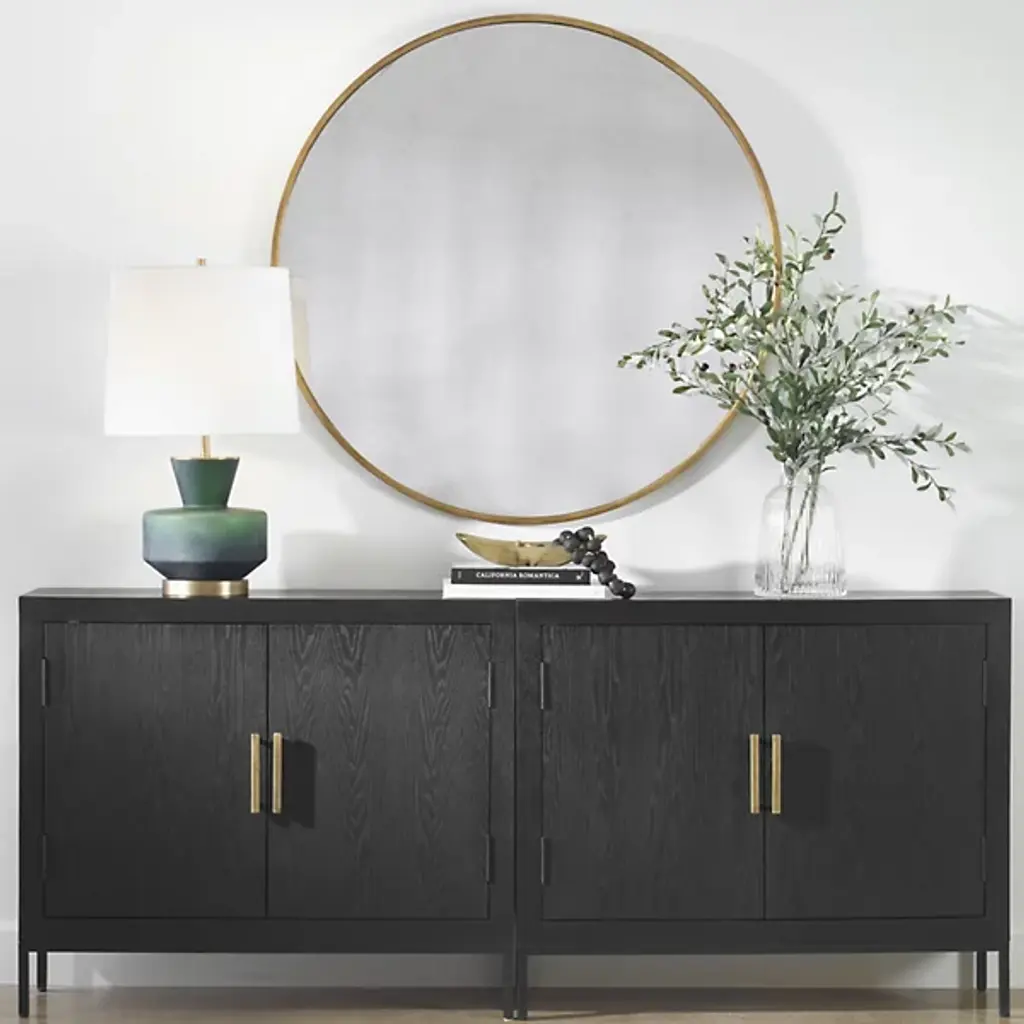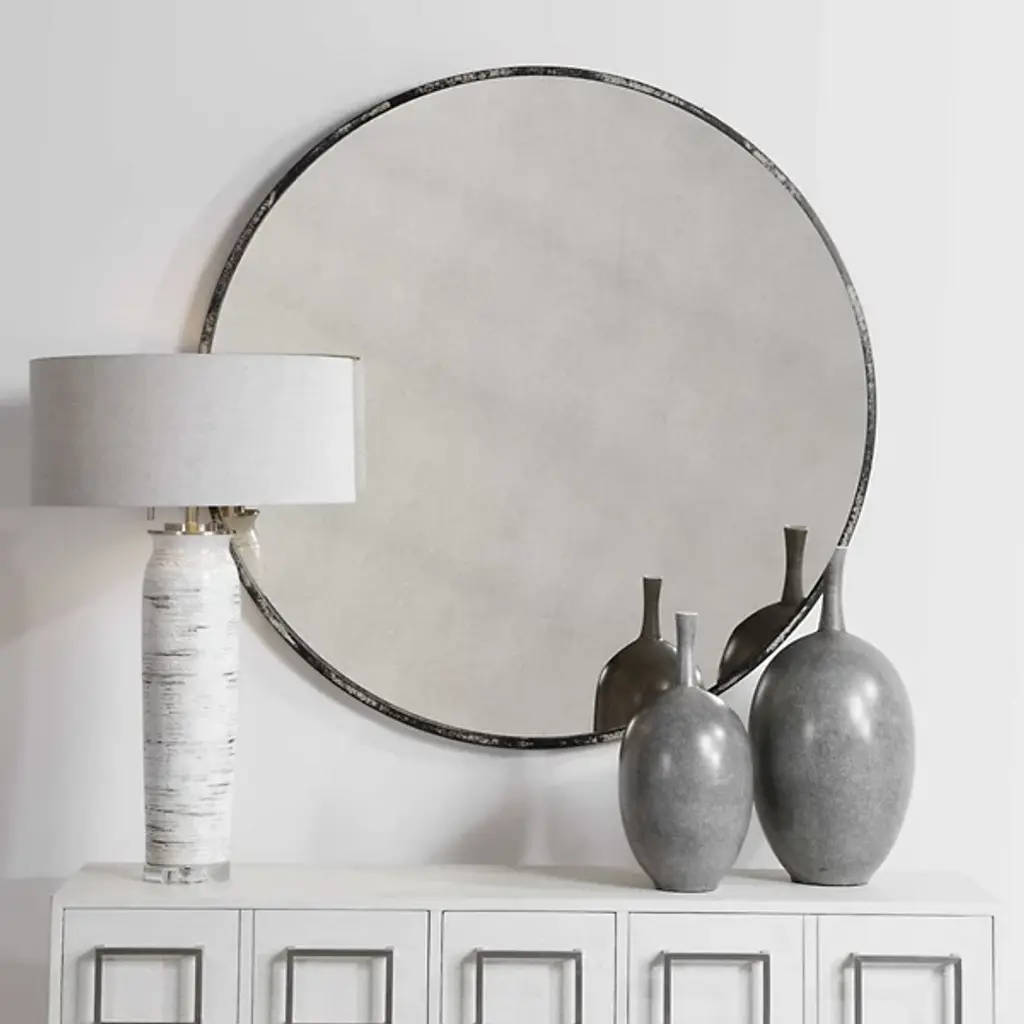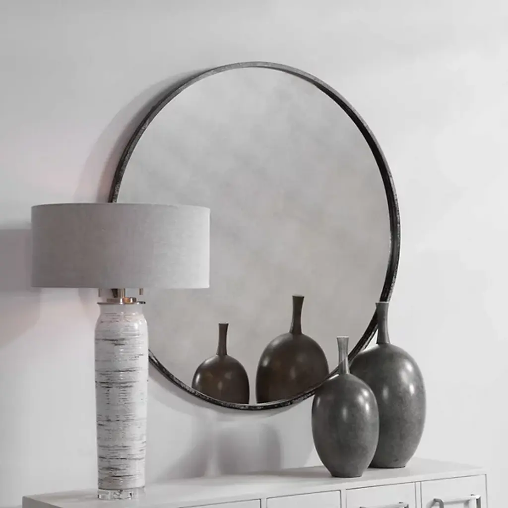 Introduce contemporary elegance with the round silhouette of the Junius Round Mirror from Uttermost. Your mirror features a slim, round metal frame. This mirror presents your reflection with clarity. Hang the Junius above your dresser to reflect light with sophistication. The round shape makes Janius a versatile addition to your 21st-century living space.