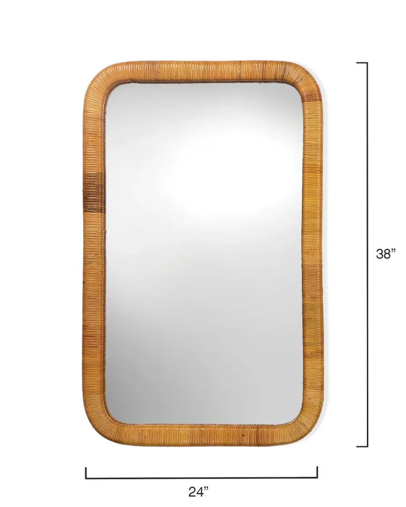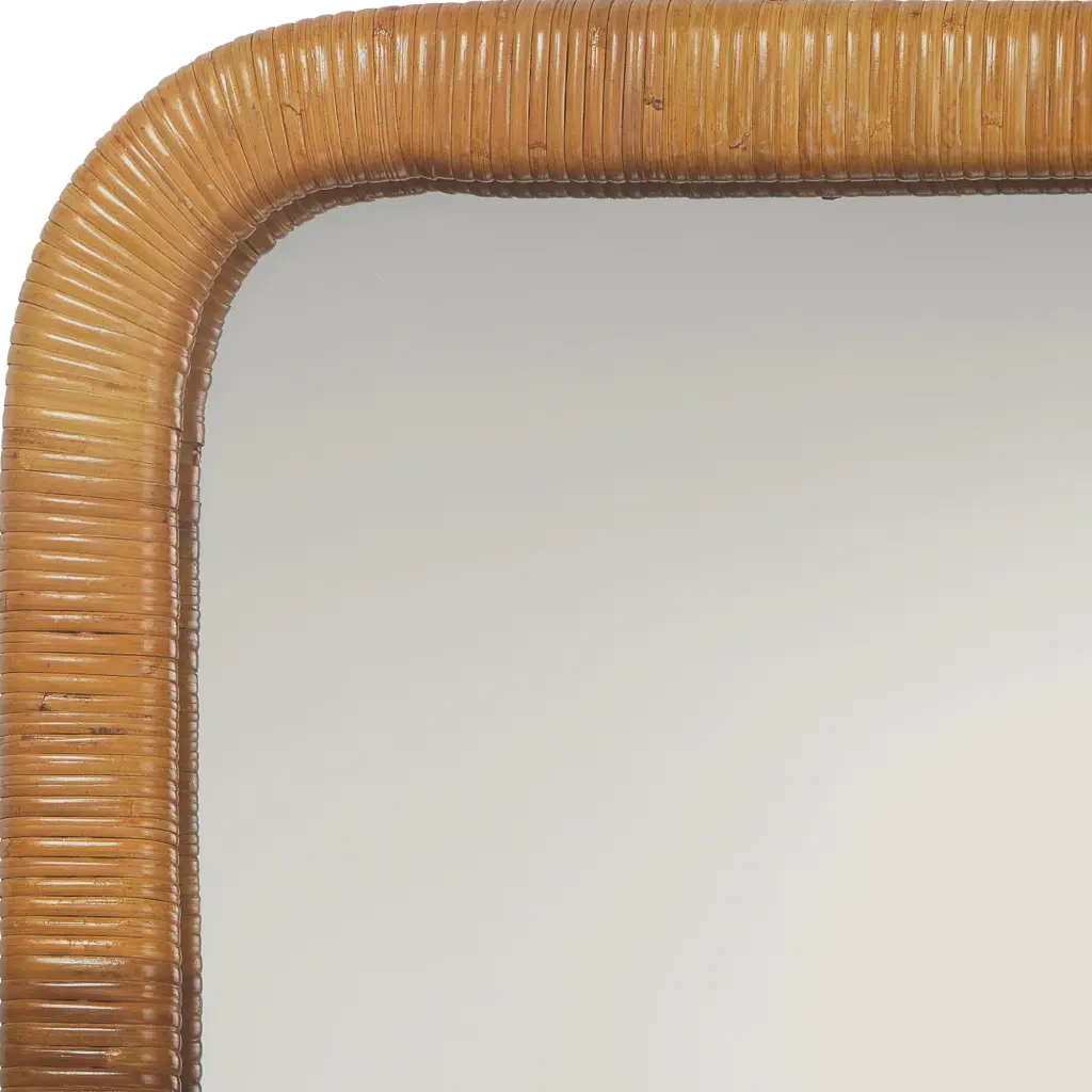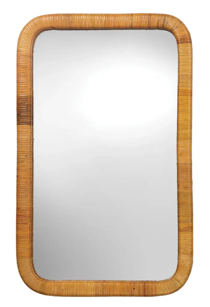 split rattan wrapped, rounded corner rectangular mirror in natural rattan finish. A little 50's coastal glam