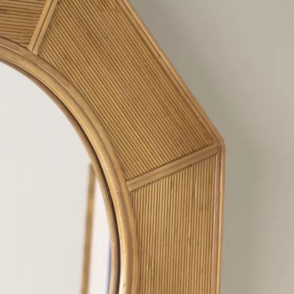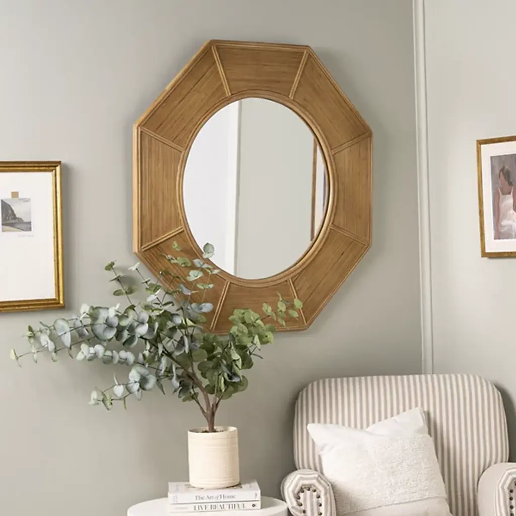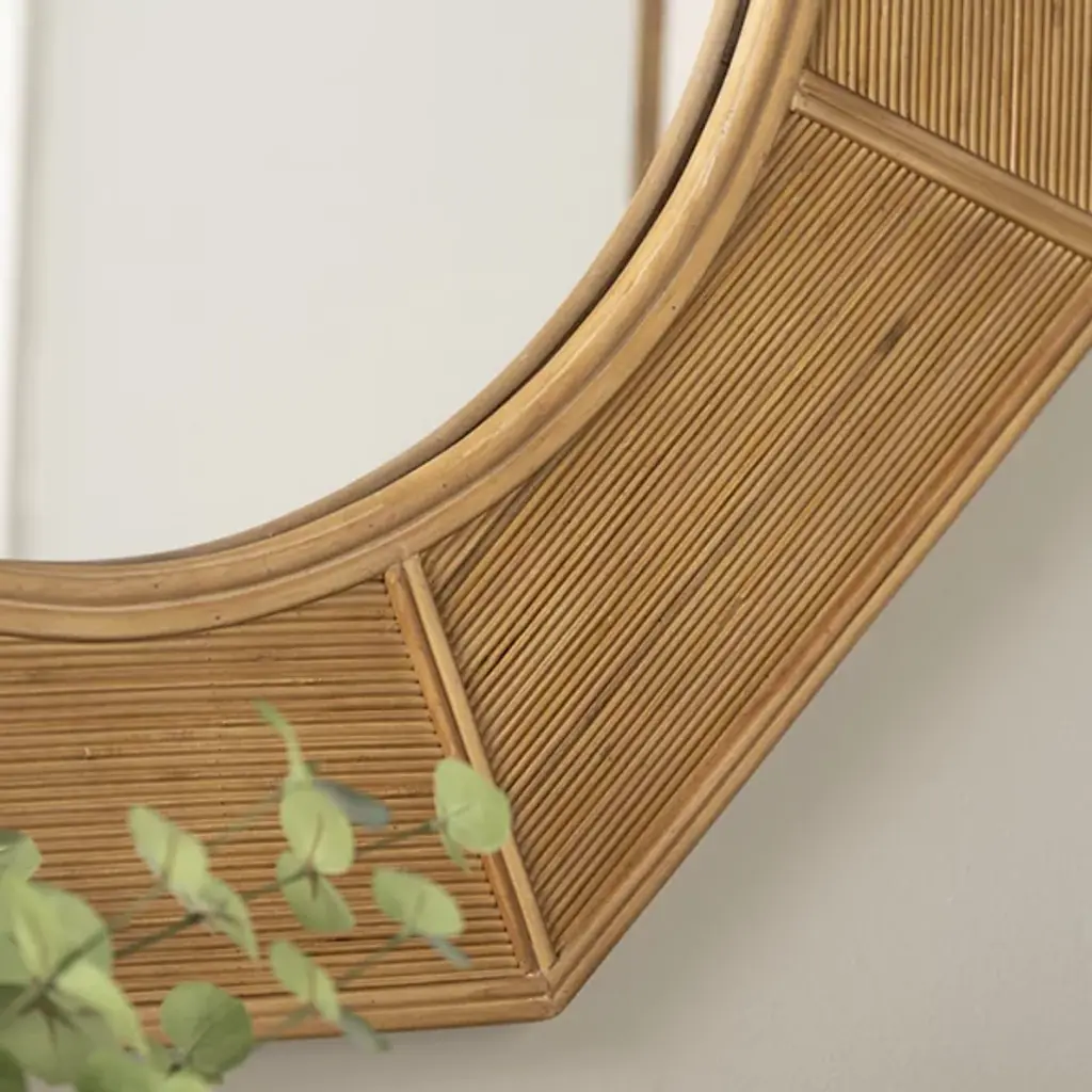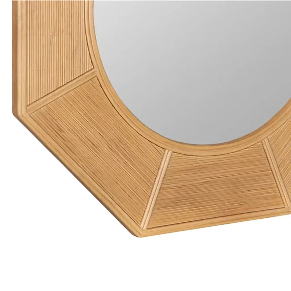 The Kali Wall Mirror from Cooper Classics redefines reflection through its dynamic design. The striking geometric frame embraces a rounded reflector and features linear accents across its surface, becoming a captivating focal point that can be mounted vertically or horizontally. Made in Indonesia, this versatile piece brings sculptural sophistication to contemporary spaces while offering flexible styling options.