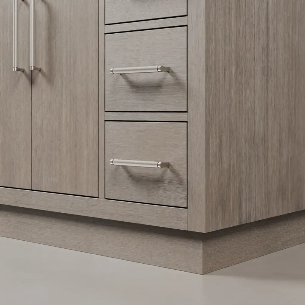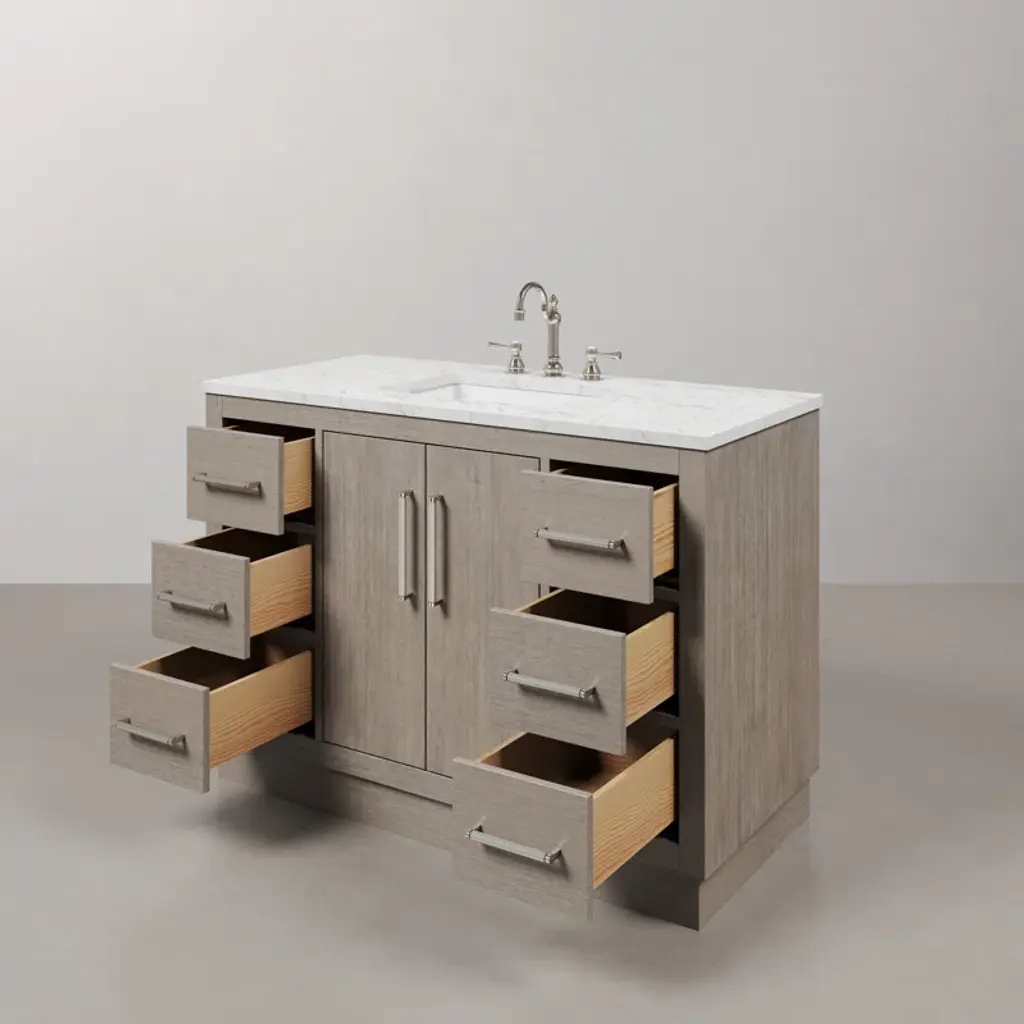 Add a rustic feel to your daily routine with this 48'' single bathroom vanity. Crafted from solid hardwood, it features a streamlined design with a gray oak hardwood base and matte white stone countertop. The undermount ceramic sink adds a clean, modern look, while the two soft-close doors and six functional drawers provide ample storage options. An adjustable shelf inside the cabinet allows you to customize your storage needs. Plus, it comes with six pre-drilled holes to suit an 8" widespread faucet of your choice (not included).