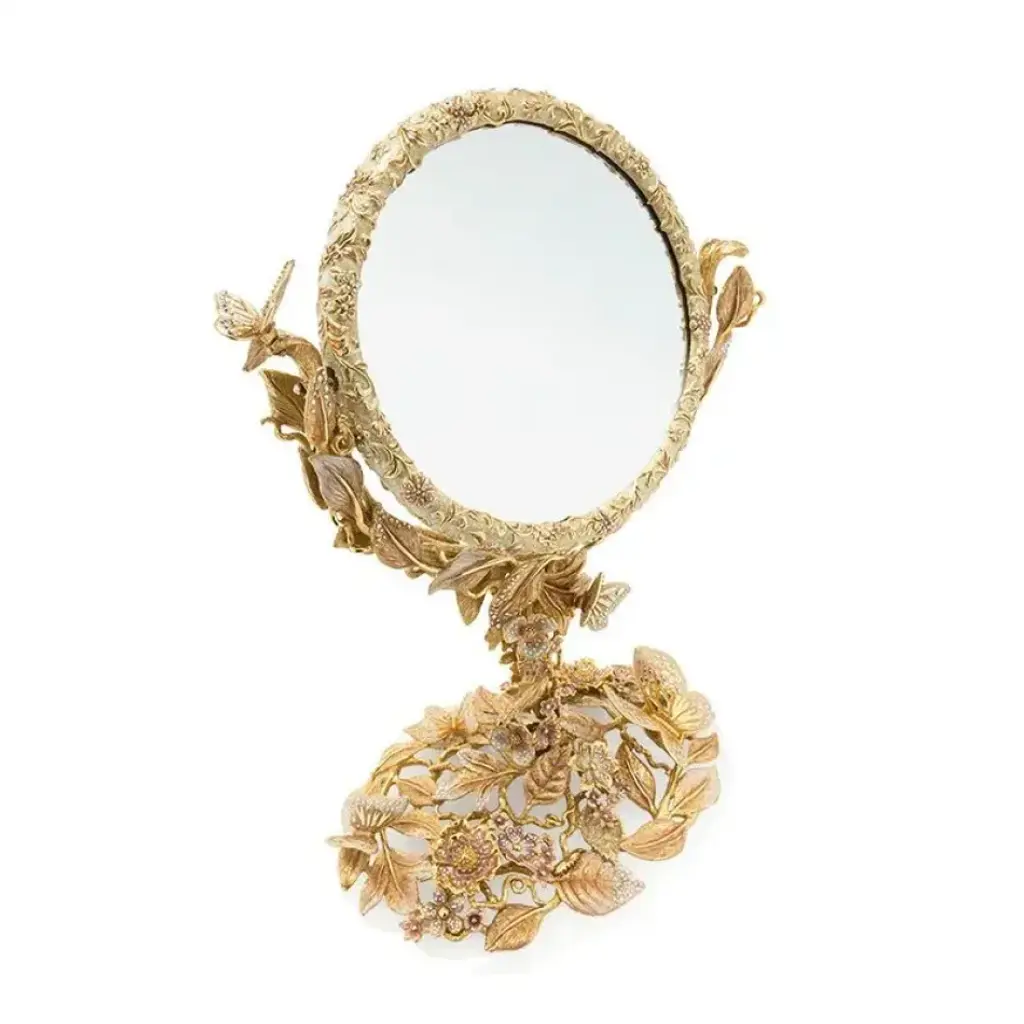 A breathtaking moment – the Kayla butterfly and floral mirror is a very personal expression of our love to create designs that bring a stunning romance to your home. The sweeping stand of flora and fauna elegantly embracing the engraved framed turning mirror. Carved in multiple parts of pewter, hand-polished and finished in 18K Gold. Hand-painted washes of blush and opal pink enamels accentuate the fine textures on each leaf, flower and butterfly. Hand-set with over one thousand Swarovski crystals in twinkling shades of silk, antique rose and opal. The talent of our finest artisans at the Jay Strongwater Rhode Island workshop truly shines.