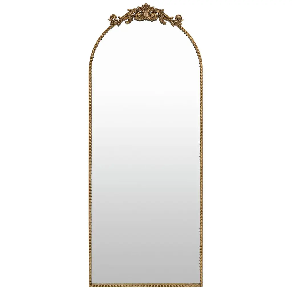Kea 42 Inch Large Wall Mirror, Gold Curved Metal Frame, Baroque DesignMade with artisanal passion and excellent craftsmanship, this sturdily crafted wall mirror adorns your home with sophistication and effortless class. Encased in a glittering gold rectangular metal frame, it has a beautifully crafted baroque accent at the top, making it more than a mirror but a striking piece of art in and of itself. Check out our Kea collection for matching items.
