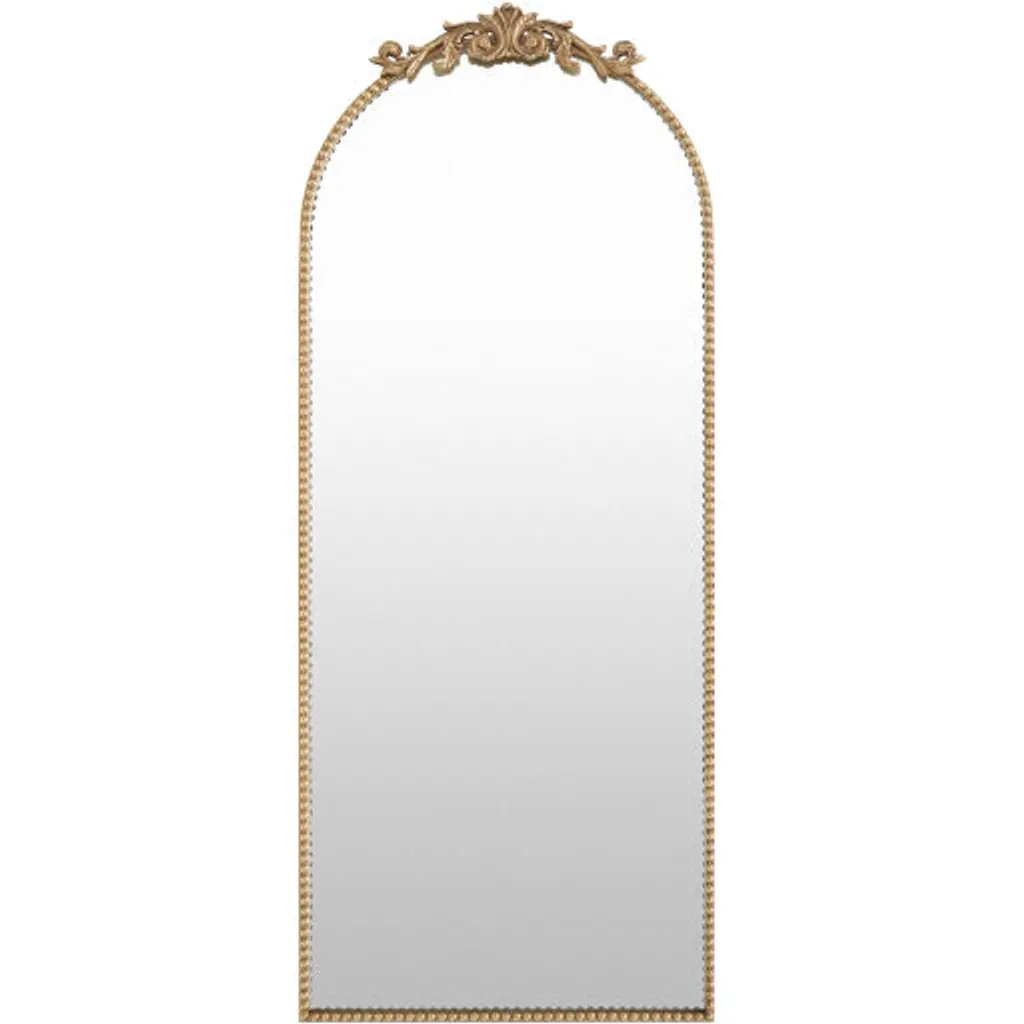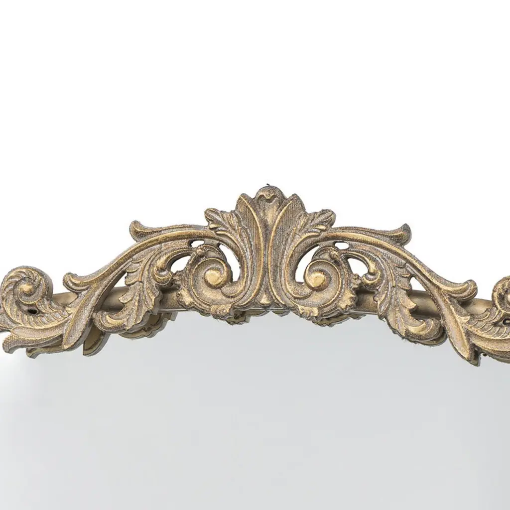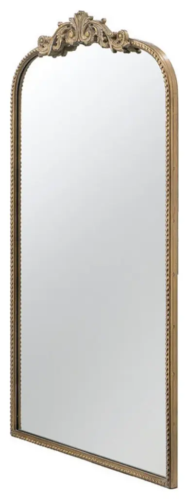 Kea 42 Inch Large Wall Mirror, Gold Curved Metal Frame, Baroque DesignMade with artisanal passion and excellent craftsmanship, this sturdily crafted wall mirror adorns your home with sophistication and effortless class. Encased in a glittering gold rectangular metal frame, it has a beautifully crafted baroque accent at the top, making it more than a mirror but a striking piece of art in and of itself. Check out our Kea collection for matching items.