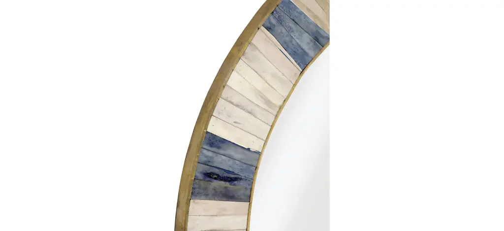 The Keena Wall Mirror is round featuring natural ivory, blue and grey bone with brass cladding accents. Two "D" ring attachment points for ease of access wall mounting is included to hang mirror. The hand crafted details produced by a skilled artist lends itself to a unique technique and will vary slightly.