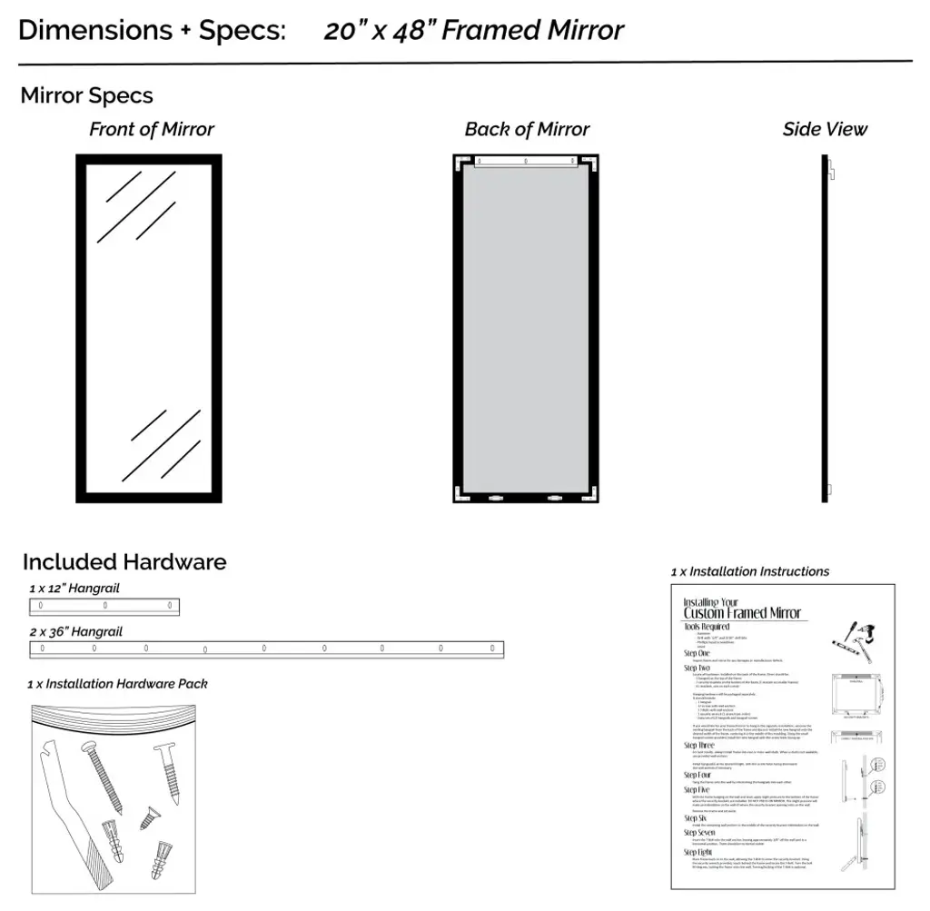The Kendall framed mirror is elegant in its simplicity. This mirror, with a traditional frame, will give your room a chic look with its gently raised outer edge and clean interior lines.Hangrail for installation will be applied on the width of the frame. All assembly hardware and instructions will be included. Additional hangrails are included if the opposite orientation is desired for installation. The dimensions displayed are the final outside dimensions of the frame, including the mirror. CATII safety backing applied on all mirrors. Approved for high-moisture areas such as bathrooms.