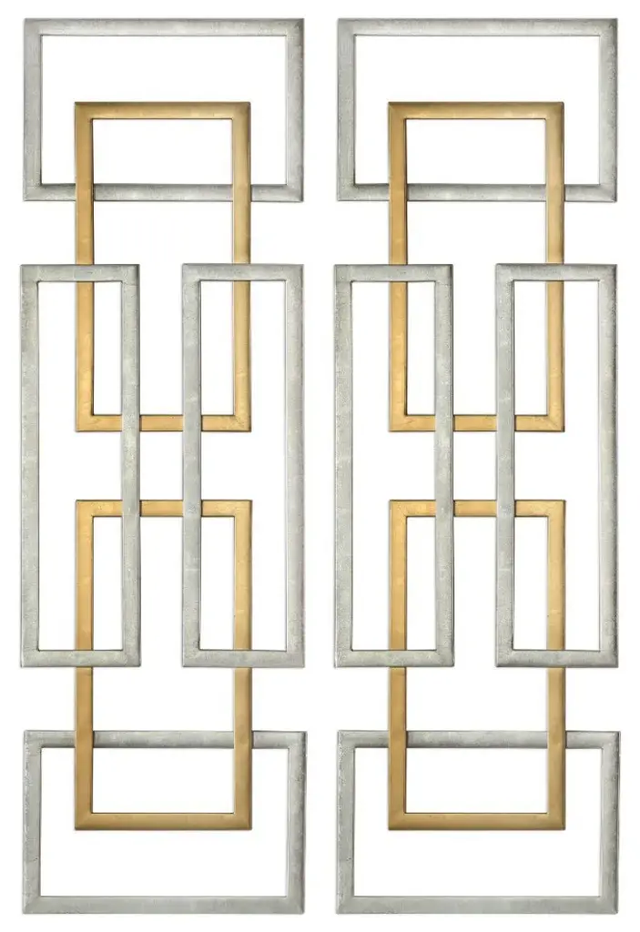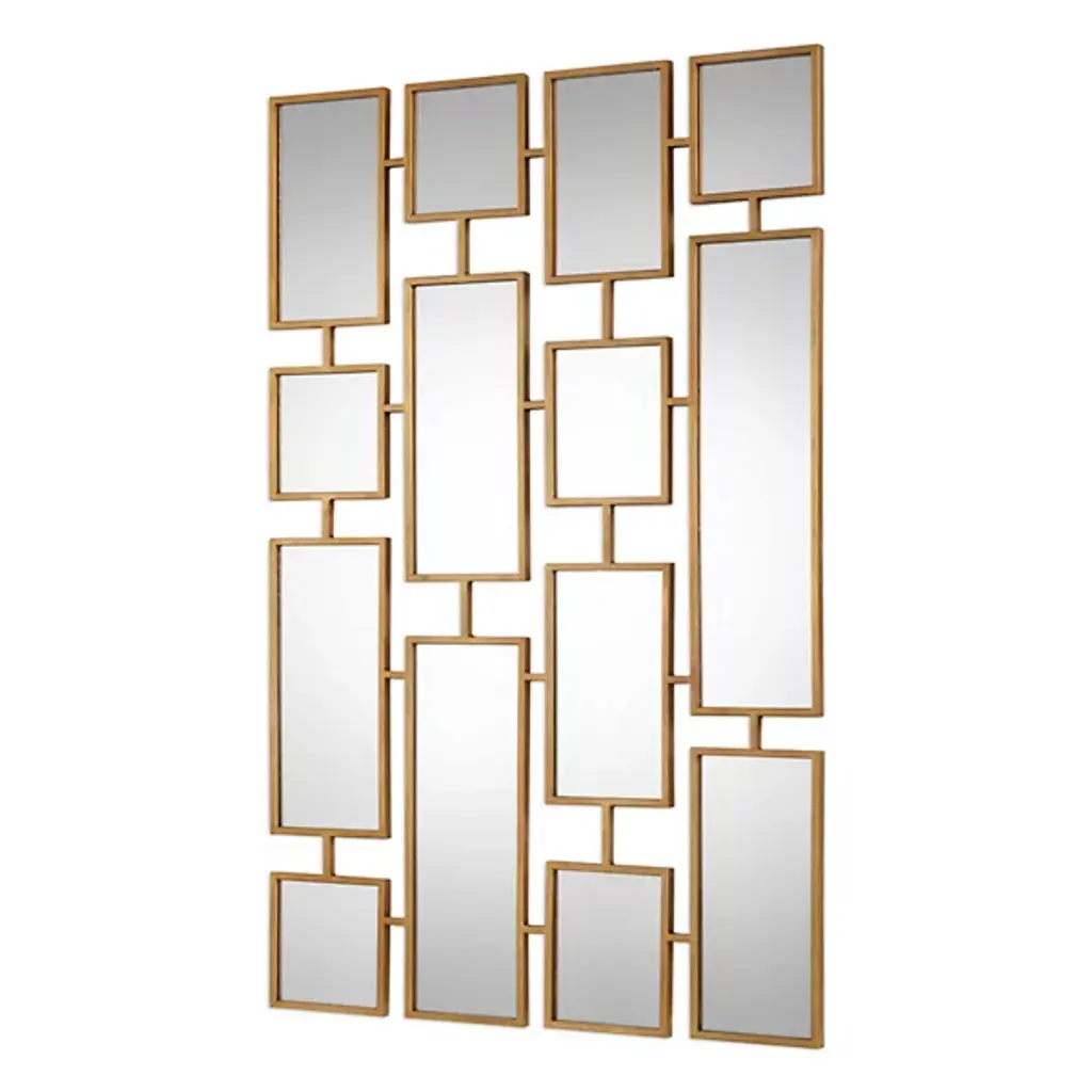The Kennon Rectangles Mirror from Uttermost brings modern design to life with its interconnected forged iron rectangle frames conspiring to create a cohesive ensemble. Each metal frame is finished in a lightly antiqued gold leaf, creating an inspired geometric masterpiece that can be suspended horizontally or vertically, depending on your space. The bold, blocky shapes and rich metallic finish draw the eye, making it a standout accent for contemporary interiors.