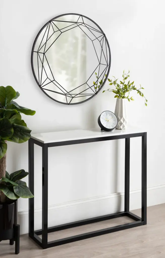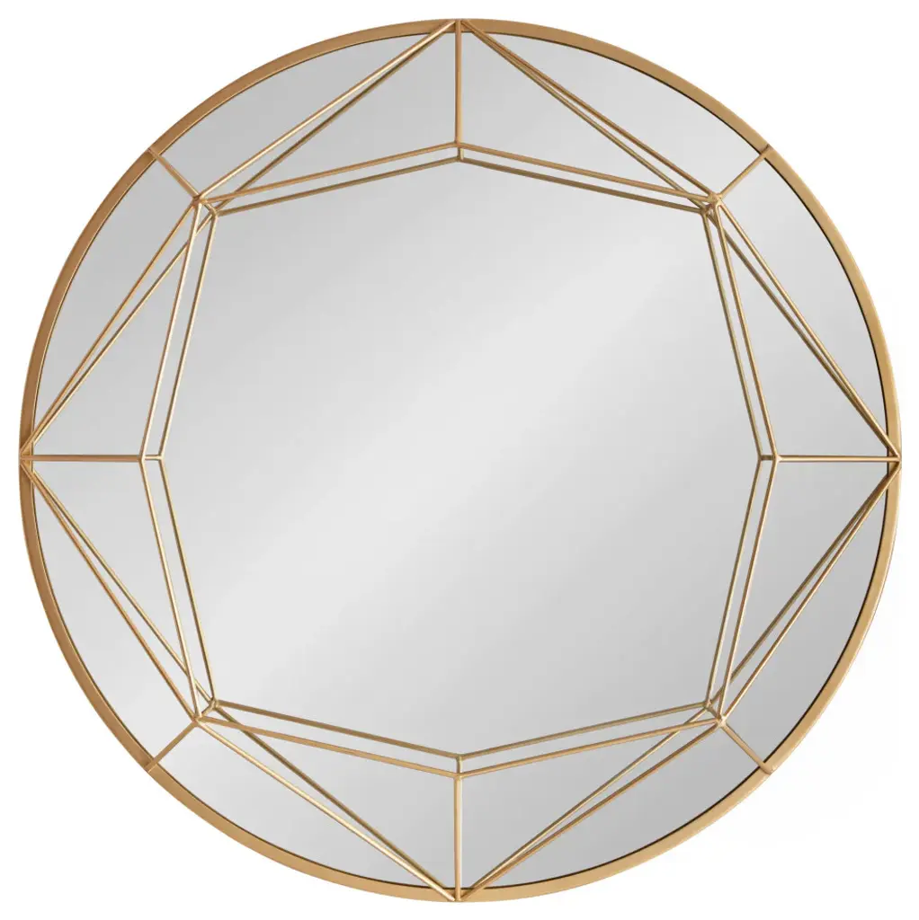 This decorative round metal mirror is an intriguing, unique accent for any room in your modern home. Hang this mirror above a fireplace, over a sofa, or above your bedroom headboard for a stunning wall staple that dazzles and presents an eye-catching focal point. What makes this mirror so intriguing is its astounding, webbed geometric overlay. Lovingly crafted metal geometric spokes overlap in a webbed style that draws the eye. The geometric lines are created with a depth of 1.75 above the mirror surface to add dimension and visual interest. This mirror has a 30" diameter for a large accent for any room. The mirror has a total depth from the wall of 2.5 inches and weighs 22.05 pounds. Keyhole hangers are attached to the back metal frame for easy wall display. This gorgeous metal contemporary wall art piece will be the perfect fit in your existing decor theme in any room of the home!• CONTEMPORARY ELEGANCE: The Keyleigh decorative wall mirror with its metal-framed geometric detail and bold finish will add a touch of glamour to your home decor• GEOMETRIC STYLE: The sophisticated round metal design of this accent mirror will look fantastic hanging above your bedroom headboard or living room sofa• LARGE SIZE: This mirror has a 30 inch diameter and is 2.5 inches deep-- just the right size for placing in a bathroom, kitchen or over a select piece of furniture• STURDY METAL FRAME: The Keyleigh mirror''s frame is constructed of a durable metal with a keyhole hanging system built in for easy wall display• DECORATIVE AND FUNCTIONAL: The overlapping welded metal spokes create an alluring way to decorate your wall while bringing light and space into the room