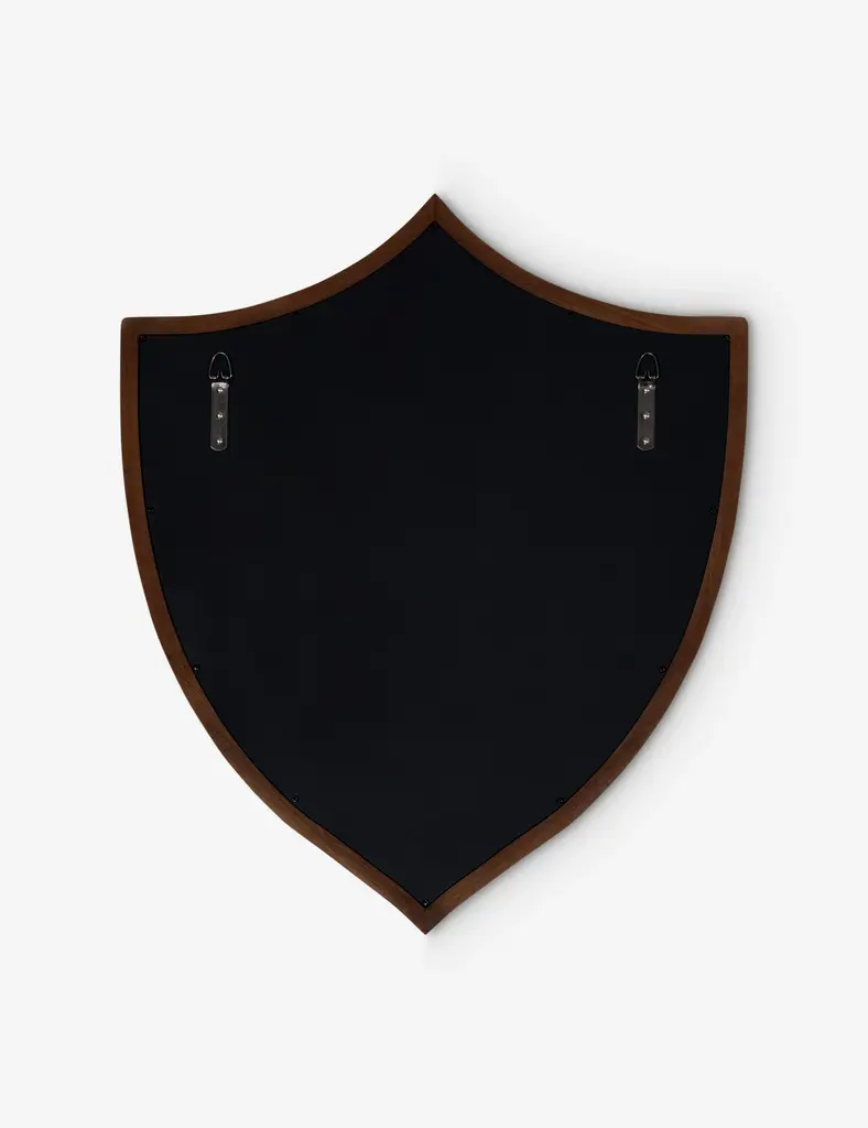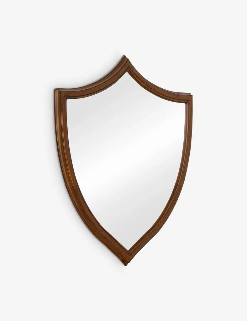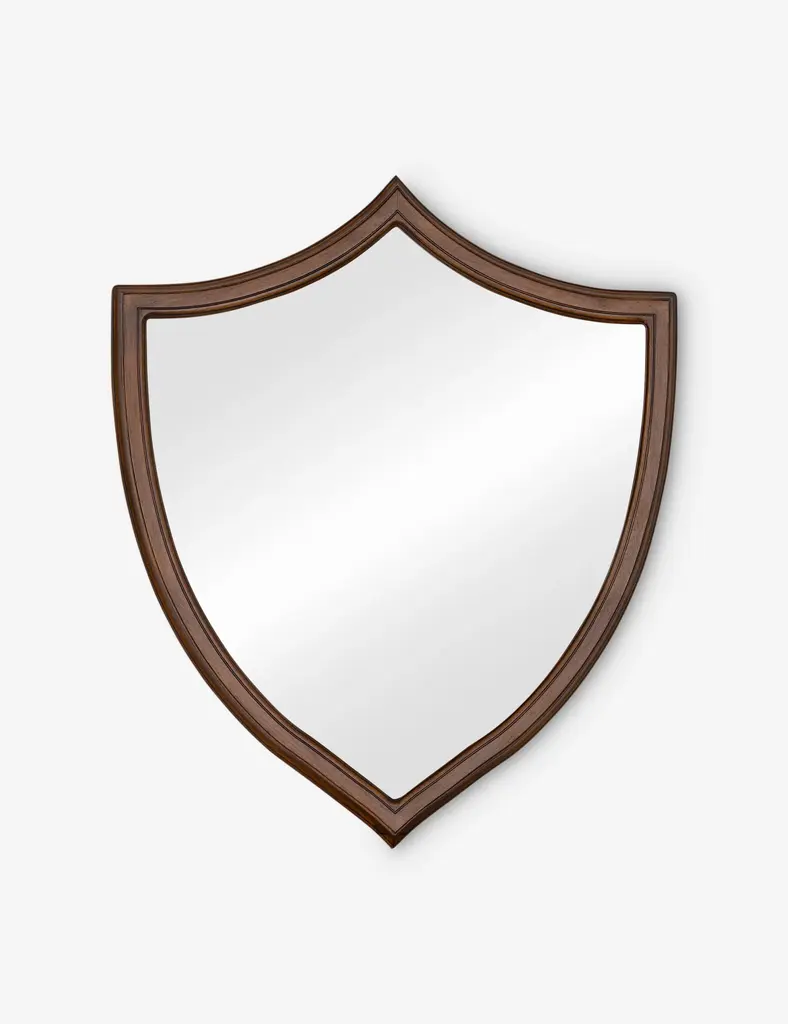 Classically drawn with a whimsical edge, the Kierse mirror brings a fresh take to traditional form. Its shield-like frame nods to vintage design with a warm mahogany finish, adding a clean-lined shape and a moment of depth to any wall.
