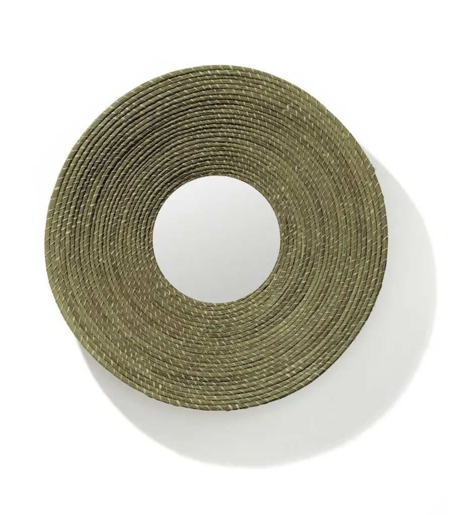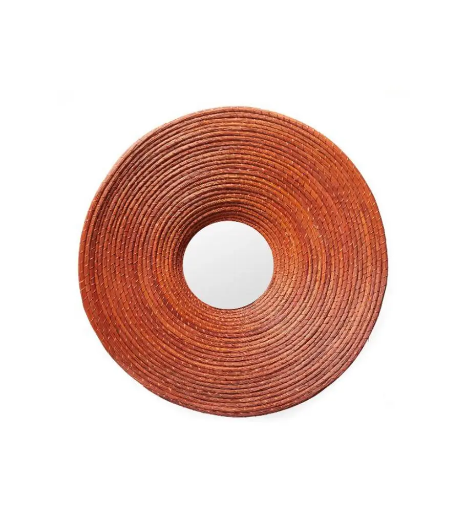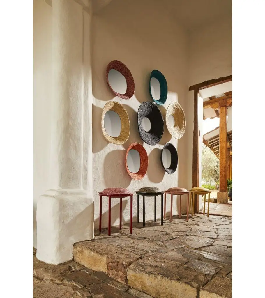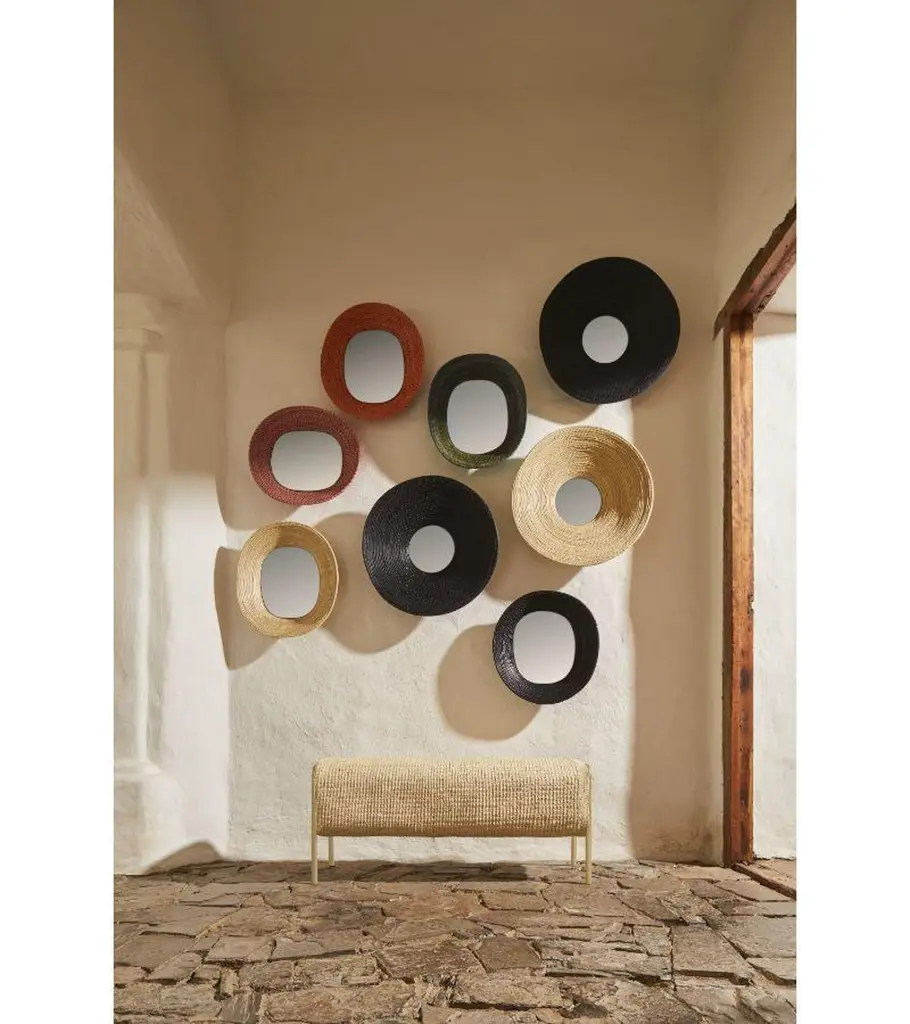 Killa round shaped mirror by Pauline DeltourMaterials: galvanized and powder-coated tubular steel frame. Fibers from Iraca palm leaves fiber.Technique: hand-woven with natural fibers in Colombia. Natural dyed. Dimensions: diameter 62 x height 62 cm Available in colors: pink/ dark red, natural, black, terracotta, and olive. Also available in different sizes and shapes.The Killa wall mirror round has been designed by Pauline Deltour after she studied the weaving techniques in local Colombian when she visited the country. The circular mirror with an oversized basket-like frame, hand-woven with fibers of the Iraca palm, makes a striking accent piece on any wall in the house. The mirror is made in the Departamento Nariño in southwest Colombia, where working with the natural material Iraca has a long tradition. The preparation of the material takes six days and the weaving of the decorative frame additional six days. Historically, the artesanos weave hats, bags, purses, ornaments, and individual one-of-a-kind pieces with the fibers of the palm. The material holds its shape and is very durable. The fibers are dyed using natural methods with seeds, leaves, nuts, and roots, and some mineral materials are also used to create different color sections. After the dyeing process, the fibers are drained and need to be left to dry for several days. Only then can the artesanos process the material. With the help of tweezers, needles, and tongs, they weave the frame by hand, using different types of stitching. Born in France, Pauline Deltour’s aesthetic is defined by being strikingly simple and beautifully detailed at once. Her designs showcase a curiosity in the qualities of the raw materials and transferring production techniques between disciplines. Pauline Deltour joined Ames founder Ana Maria Calderón Kayser on a trip to Colombia to study the local materials first hand and learn from the artisans about the traditional weaving techniques. Back in her Paris studio, where she develops furniture and product designs for international brands, Deltour designed a range of furniture and living accessories for Ames.