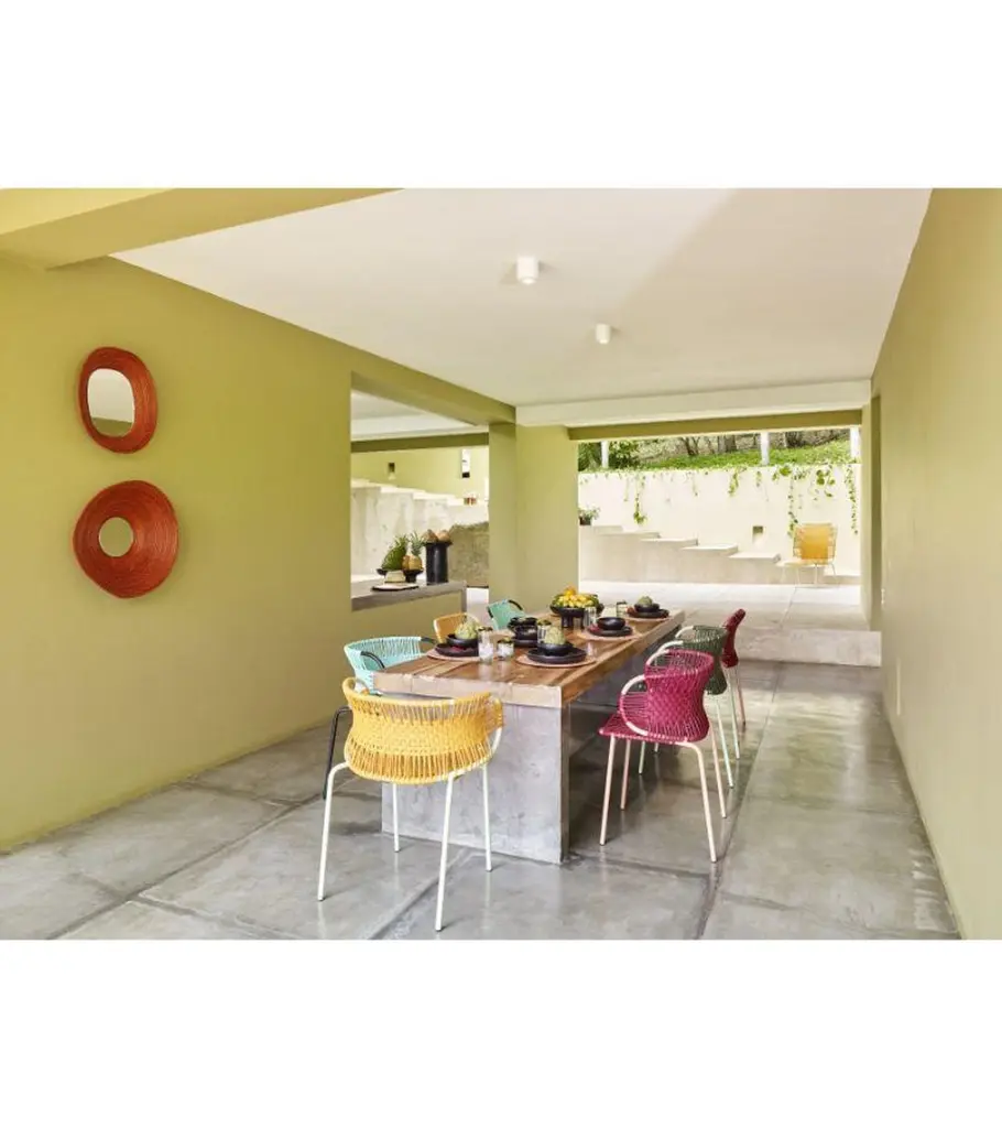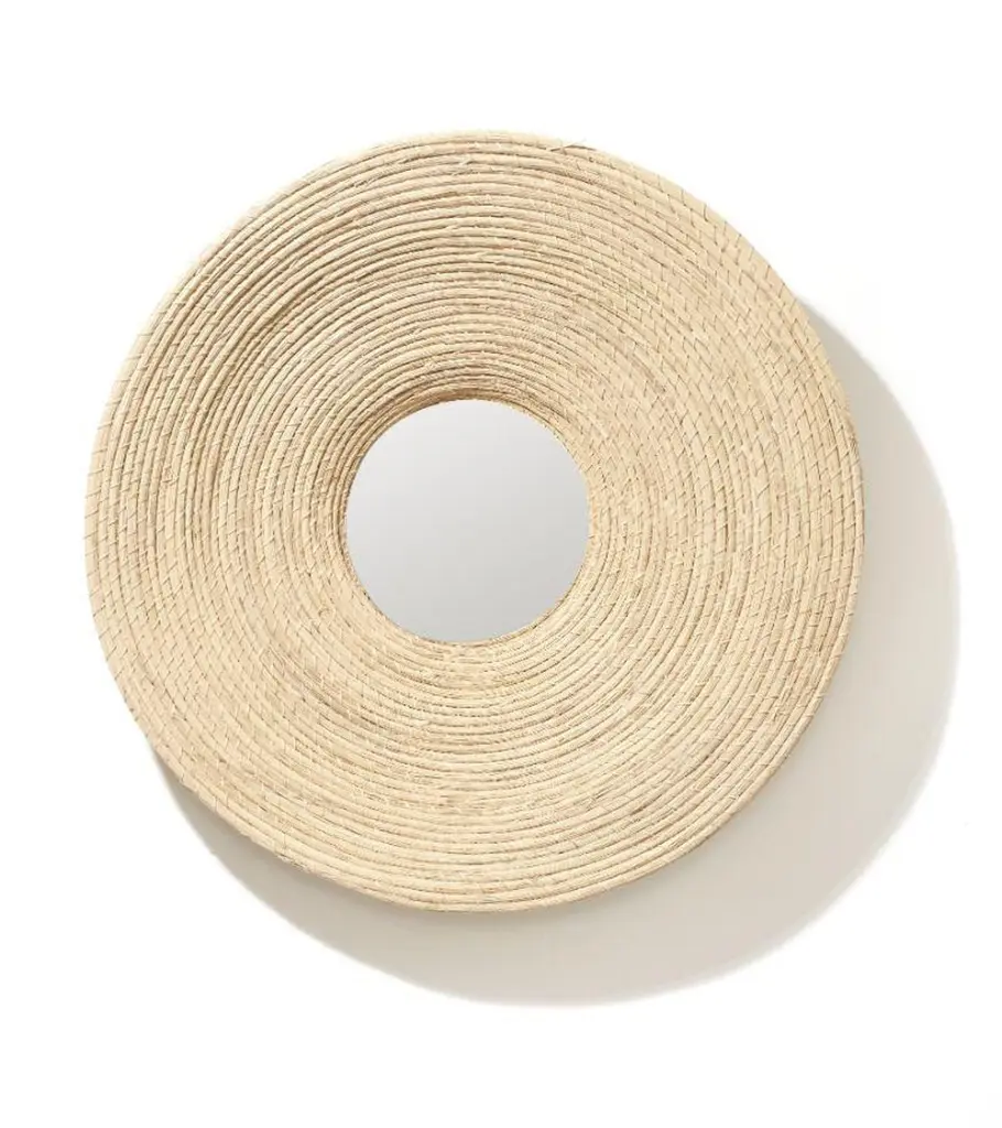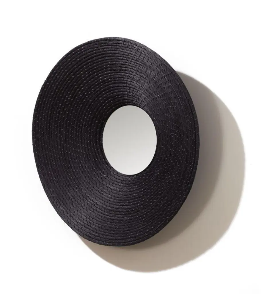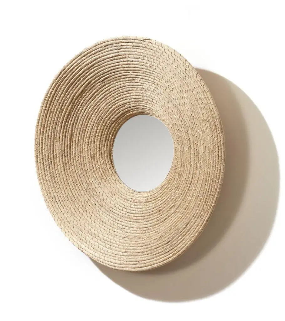 Killa round shaped mirror by Pauline DeltourMaterials: galvanized and powder-coated tubular steel frame. Fibers from Iraca palm leaves fiber.Technique: hand-woven with natural fibers in Colombia. Natural dyed. Dimensions: diameter 62 x height 62 cm Available in colors: pink/ dark red, natural, black, terracotta, and olive. Also available in different sizes and shapes.The Killa wall mirror round has been designed by Pauline Deltour after she studied the weaving techniques in local Colombian when she visited the country. The circular mirror with an oversized basket-like frame, hand-woven with fibers of the Iraca palm, makes a striking accent piece on any wall in the house. The mirror is made in the Departamento Nariño in southwest Colombia, where working with the natural material Iraca has a long tradition. The preparation of the material takes six days and the weaving of the decorative frame additional six days. Historically, the artesanos weave hats, bags, purses, ornaments, and individual one-of-a-kind pieces with the fibers of the palm. The material holds its shape and is very durable. The fibers are dyed using natural methods with seeds, leaves, nuts, and roots, and some mineral materials are also used to create different color sections. After the dyeing process, the fibers are drained and need to be left to dry for several days. Only then can the artesanos process the material. With the help of tweezers, needles, and tongs, they weave the frame by hand, using different types of stitching. Born in France, Pauline Deltour’s aesthetic is defined by being strikingly simple and beautifully detailed at once. Her designs showcase a curiosity in the qualities of the raw materials and transferring production techniques between disciplines. Pauline Deltour joined Ames founder Ana Maria Calderón Kayser on a trip to Colombia to study the local materials first hand and learn from the artisans about the traditional weaving techniques. Back in her Paris studio, where she develops furniture and product designs for international brands, Deltour designed a range of furniture and living accessories for Ames.