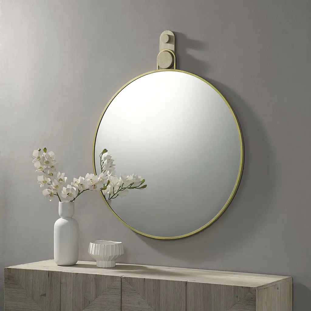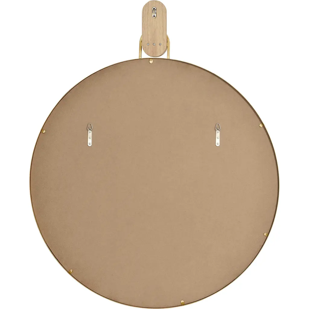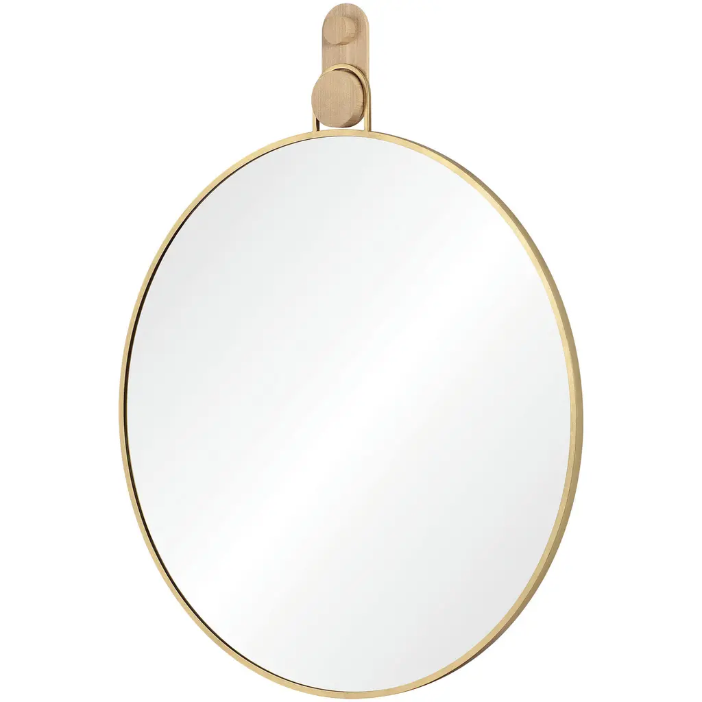 Capable of pairing with rich jewel hues and organic-inspired neutral hues, this framed wallmount mirror enhances the luxe appeal of the pieces in its midst in an understated way. Thanks to a circular structure, this mirror's smooth angles gleam and glow when cast by nearby light. Composed of iron and oak, this piece's decorative knob and differing textures and tones add a level of complexity to its impression.