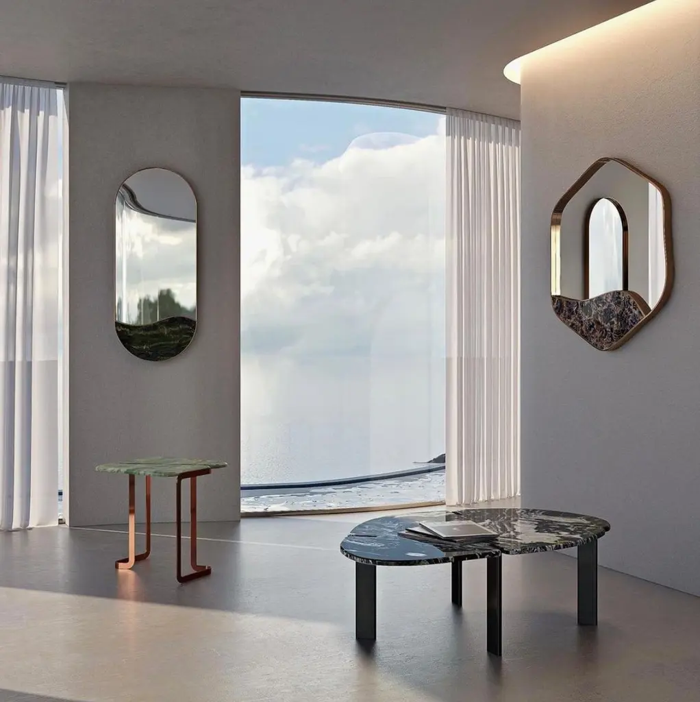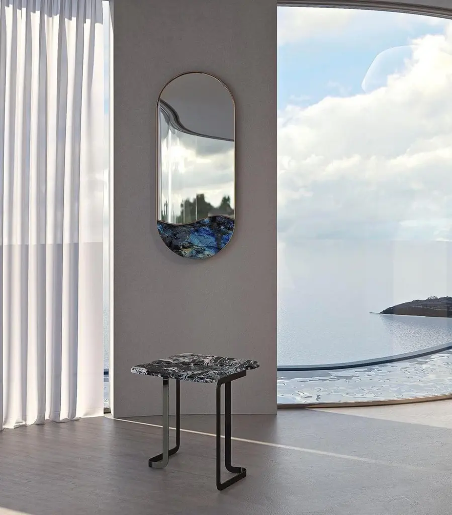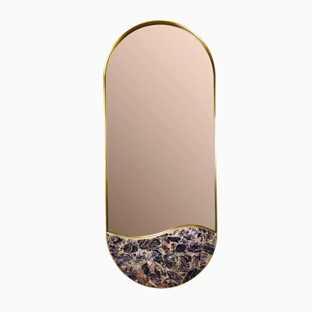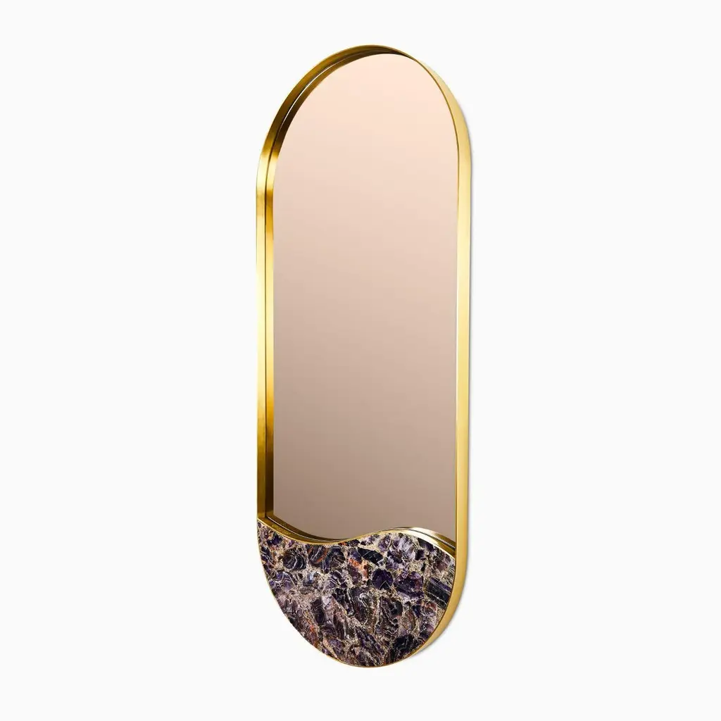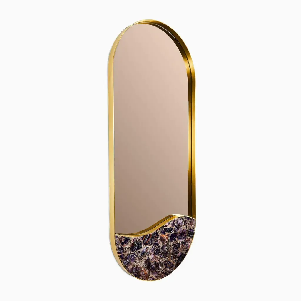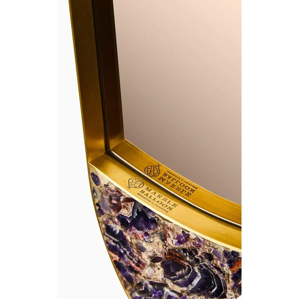 Kura mirror amethyst by Marble BalloonDimensions: 120 x 50 x 5 cmMaterials: Brass, onyx green stone.100% brass material is used in the frame and green onyx stone is used in the lower part.Marble Balloon is an interior design and high end furniture brand based in Istanbul. We are devoted to create refined and sophisticated designs bringing the premium quality materials and finest craftsmanship together. Adhering to a design philosophy cherishing organic and asymmetrical forms whilst challenging the nature of marbles implying fluidity, we incorporate only the extraordinary marbles and natural stones into our handcrafted and timeless creations.