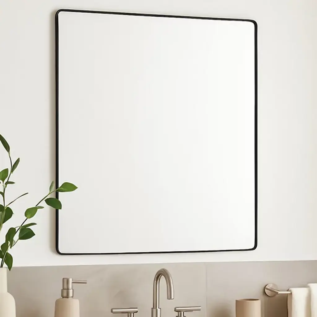 An oversized accent for modern interiors. The Kye Accent Mirror by Varaluz is a large square mirror that has a slender Metal frame with rounded corners that soften its clean, modern profile just so. The mirrored Glass surface is recessed slightly, giving an unexpected sense of depth to the otherwise minimalist design. The scale of this piece is what will really impress in a contemporary space. Try it over the sink in a bathroom, in an entryway to make it feel larger or in any other living area you need.