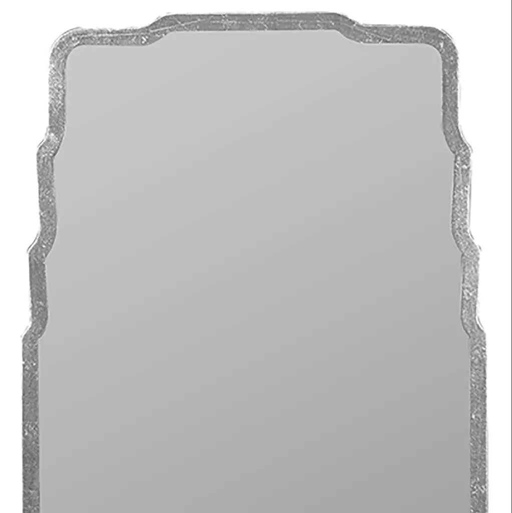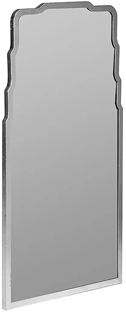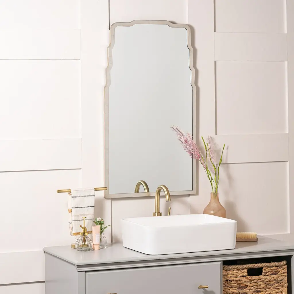 Stepped curves along the top give this rectangular mirror a regal quality that is enhanced by the glimmer of its frame.