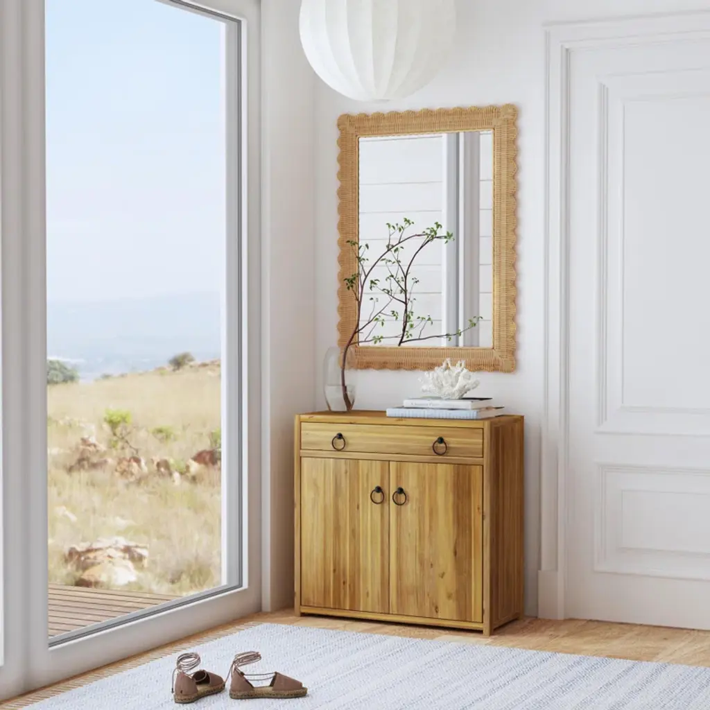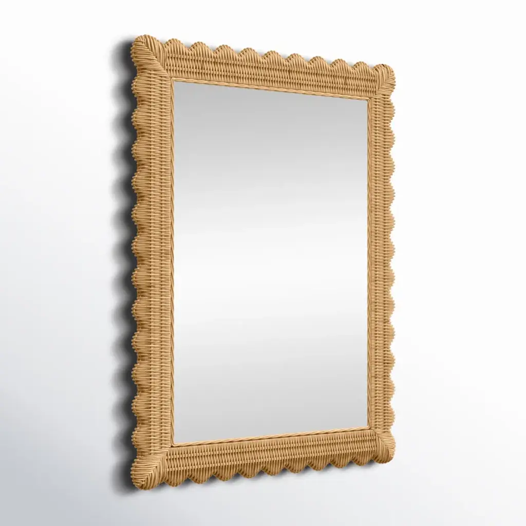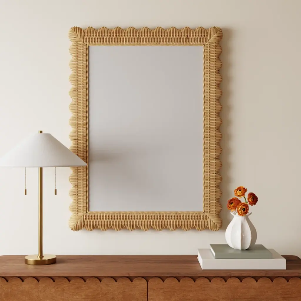 Elevate your space with our natural rattan wall mirror. Crafted with love, this accent mirror adds elegance, and the hand-woven rattan with scalloped edges embodies timeless romance. Bring warmth and charm to your home