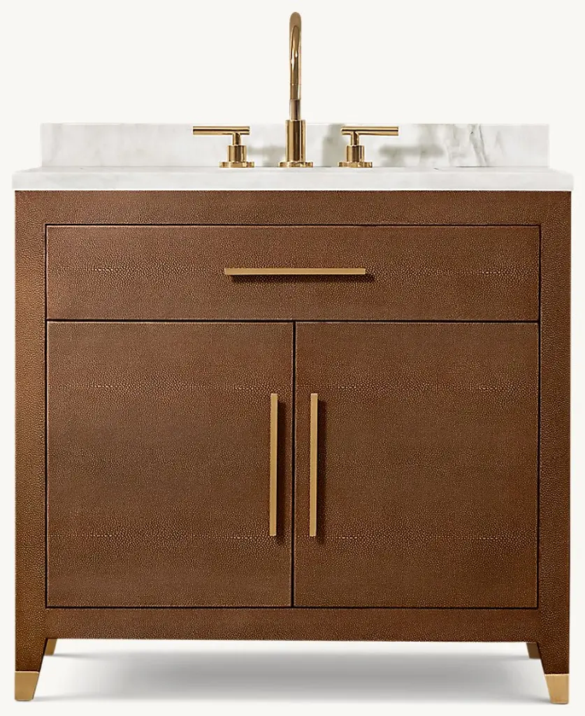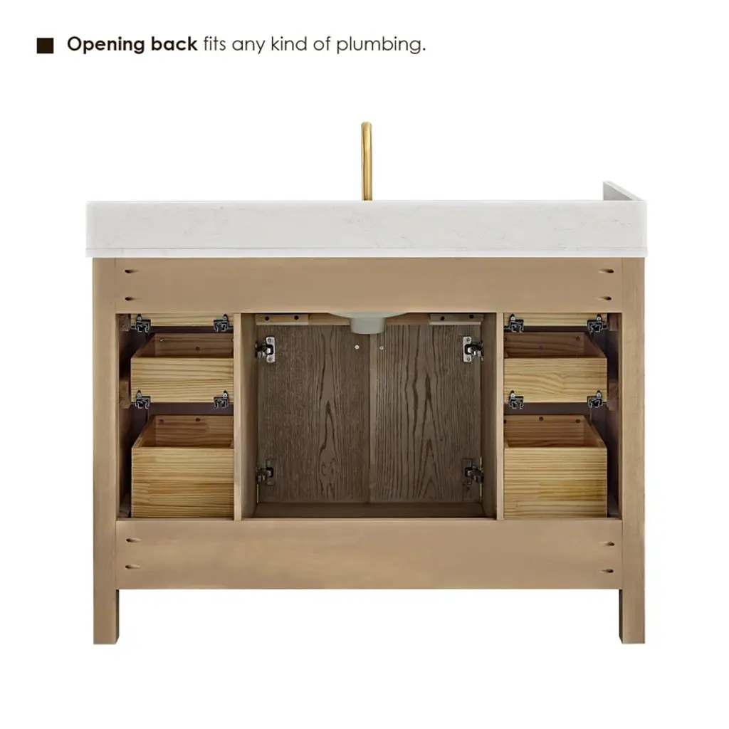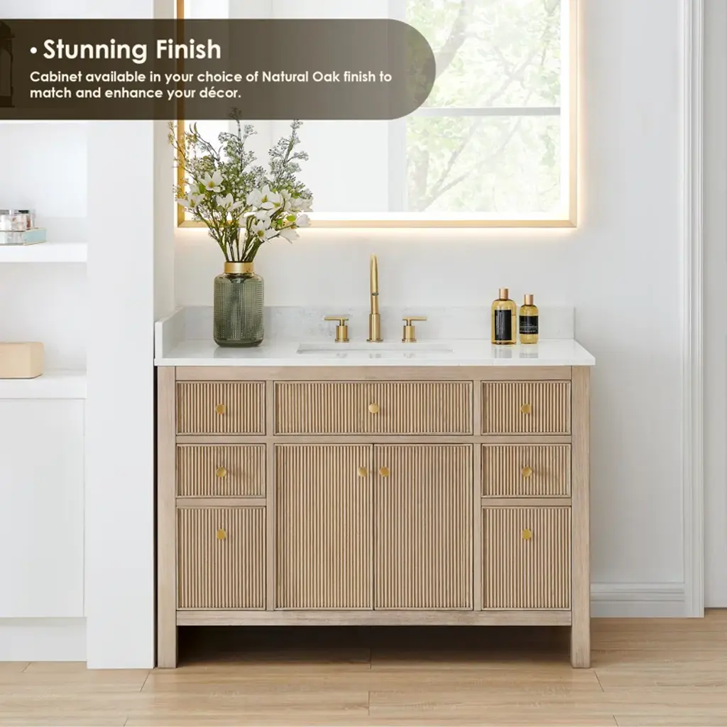 This single bathroom vanity elevates your space with a fusion of contemporary elegance and essential functionality. The frame is crafted from solid and engineered wood and features two fluted soft-closing doors that beautifully showcase the wood grain. It includes a thick, grain white engineered stone countertop with a nano-coated ceramic undermount sink. With seven functional drawers, including two unique two-in-one drawers, this piece offers ample storage.