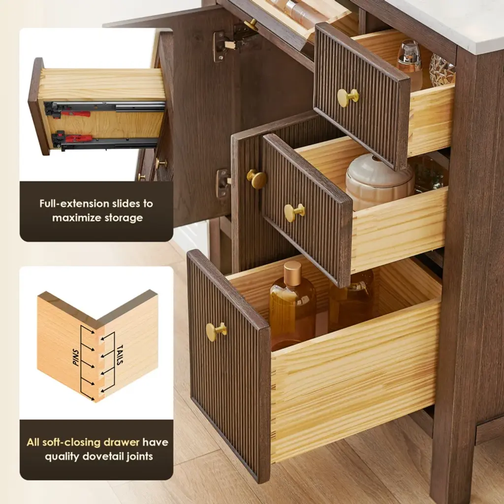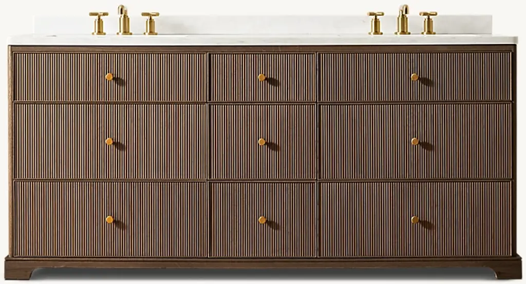 This double bathroom vanity provides a sophisticated update for your main bathroom, blending contemporary elegance with natural charm. The frame is constructed from solid and engineered wood and features four fluted soft-closing doors that beautifully showcase the wood grain. It is topped with a grain white engineered stone countertop and two nano-coated ceramic undermount sinks. With five functional drawers and soft-closing hardware, this vanity offers ample and practical storage.