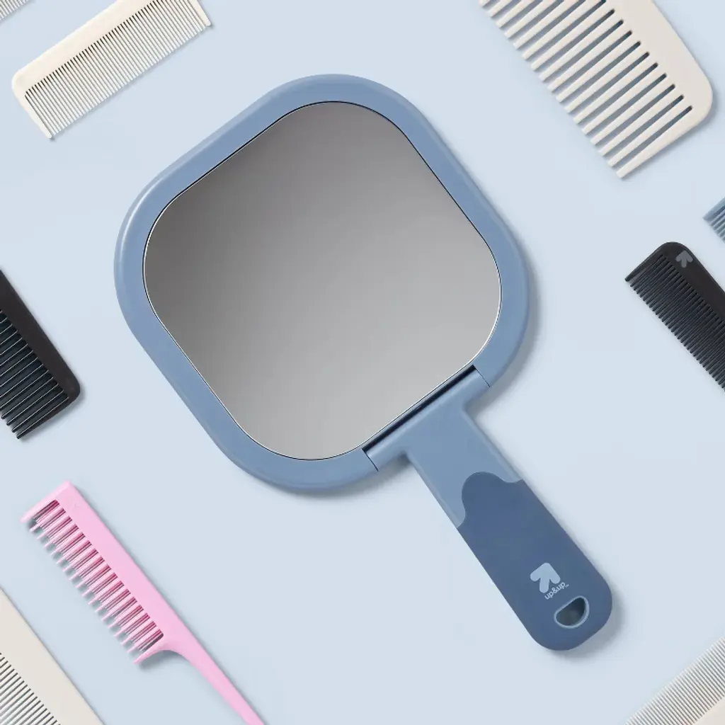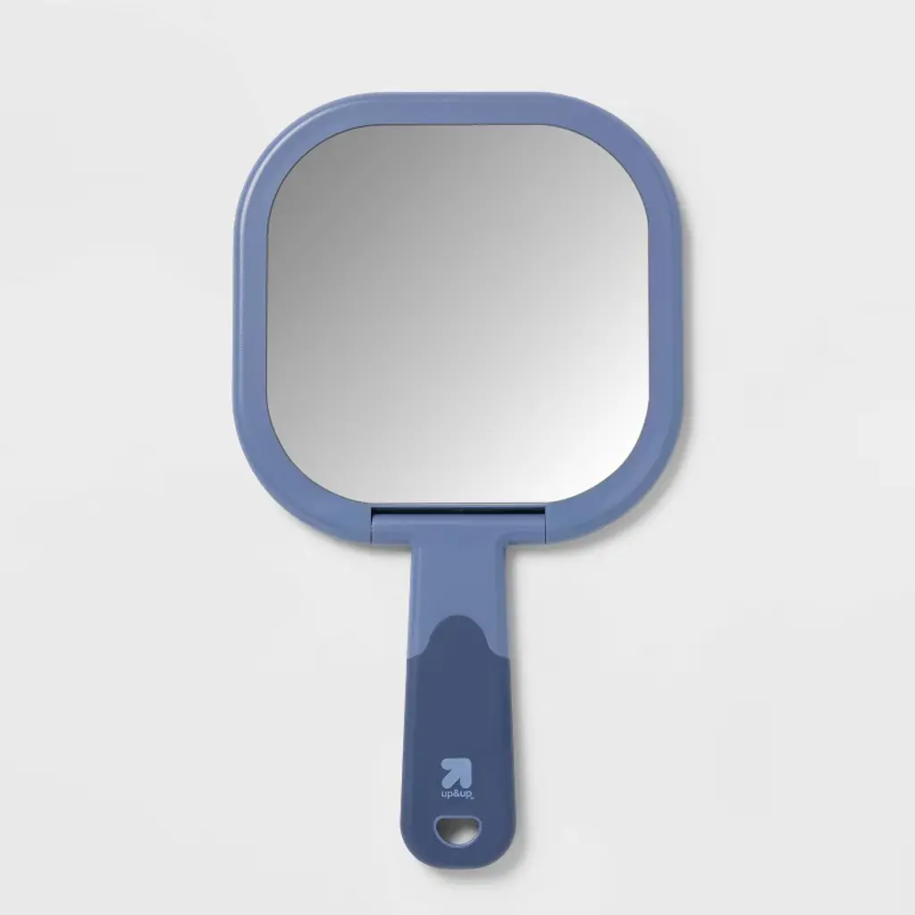 Upgrade your grooming game with this Large 2-Sided Handheld Makeup Mirror 0x Magnification from up&up™. The square mirror features a two-sided design that lets you switch from a regular mirror to a magnifying mirror for checking your makeup, tweezing eyebrows and much more. With its blue plastic frame, it converts easily for handheld use or folds neatly to stand on a countertop. Whether you keep it on your bathroom counter or your bedroom vanity, you'll always have the views you need to fine-tune your look.up&up™: We believe making smart choices for the people, places, and pets in your life should be easy and affordable. And, having quality you can trust should be a given. That’s why you can count on our promise – caring for your everyday in every way.Satisfaction guaranteed – Love it or your money back.