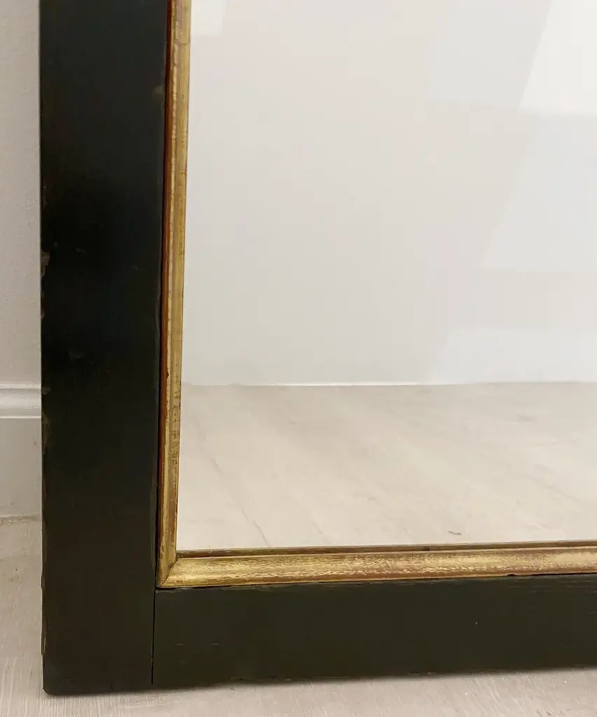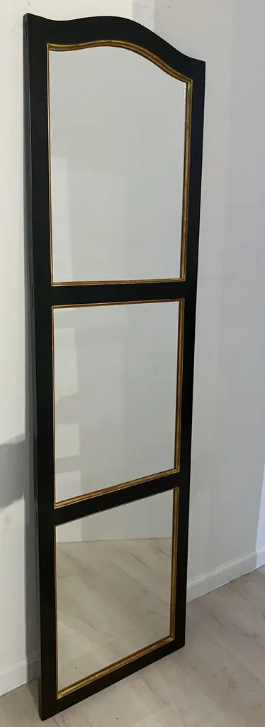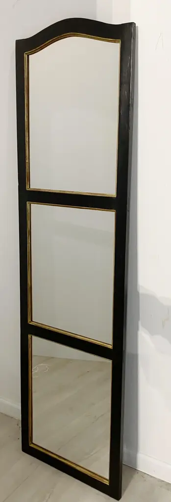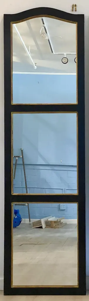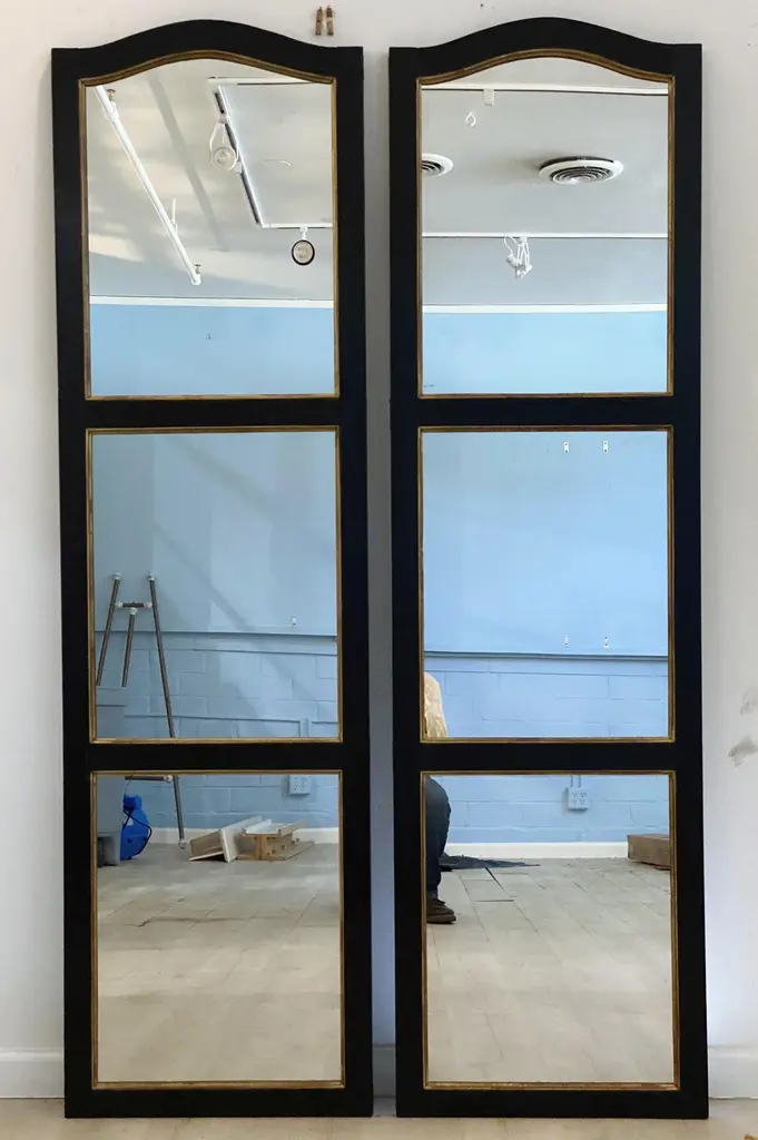 A handsome pair of large decorative window pane paneled mirrors from England - each mirror featuring an ebonized frame with gilt accents surrounding three panels with mirrored glass. Each paneled mirror measures: H 74" x W 20.88'' x D 1.13'' Individually Priced: $3495 each mirror