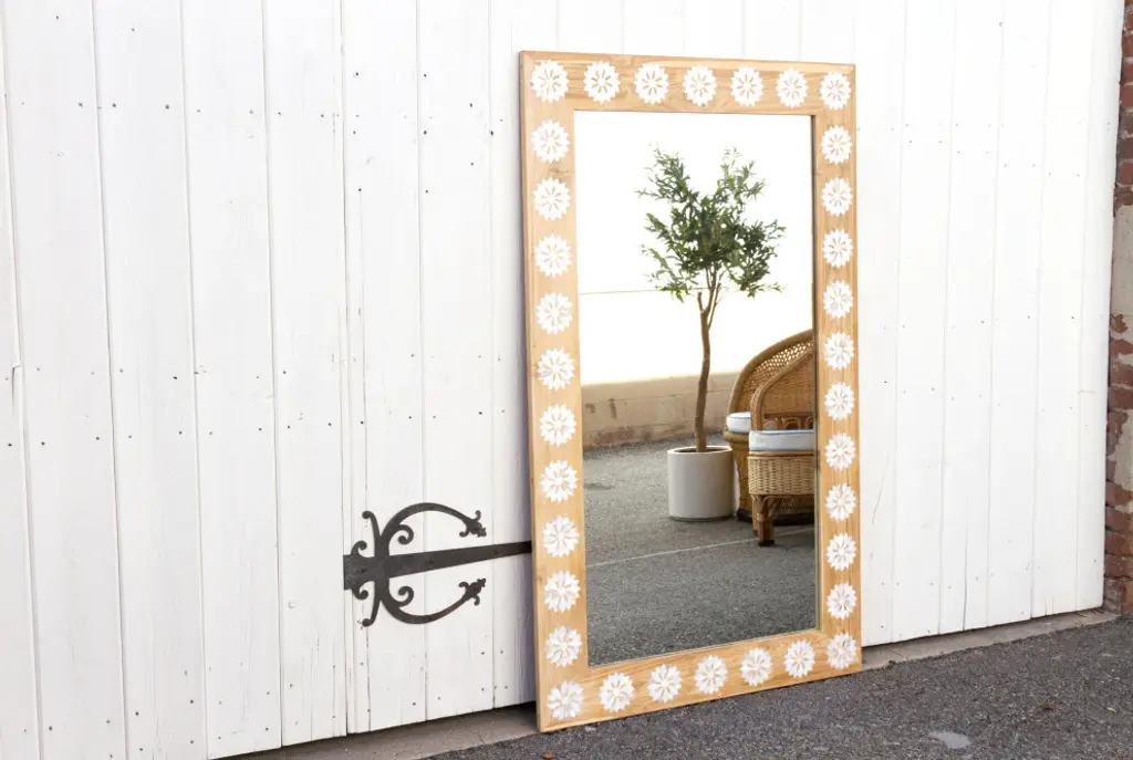 Showing clean contemporary lines contrasting with reclaimed teak and handmade inlay work. This beautiful boho modern mirror would be a staple in any home. Our blossom mother of pearl inlay collection is inspired by the opening of a lotus flower which is a symbol of purity and enlightenment. The reclaimed teak is hand-carved forming the flower shape, the inlay pieces are cut and carefully hammered into the wood to create the lovely lotus design.
