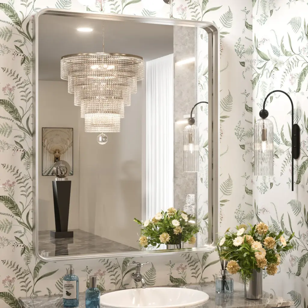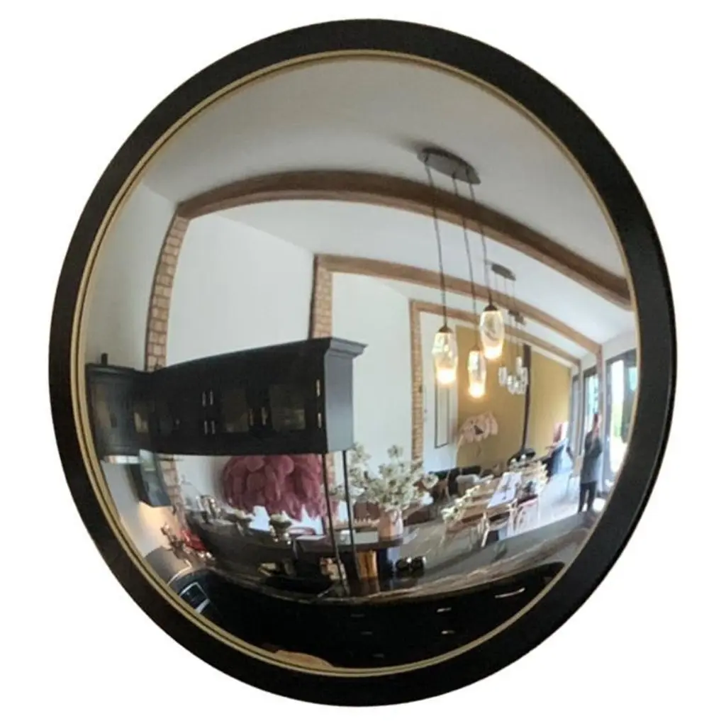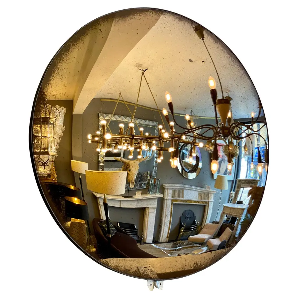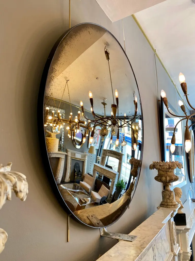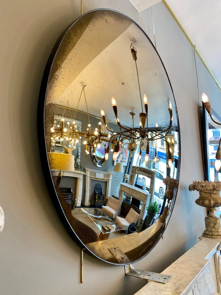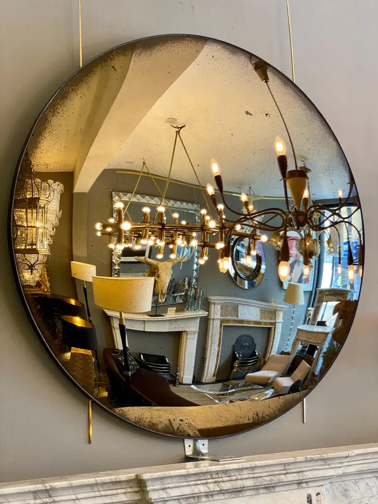 A contemporary convex bronze mirror, with distressed finish within a burnished steel banded frame. Handmade in the UK.