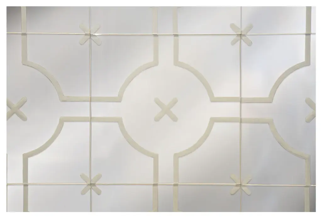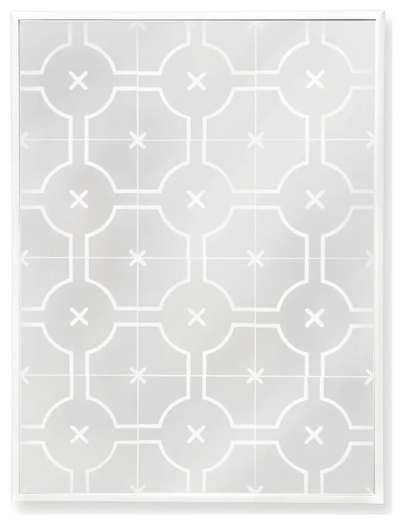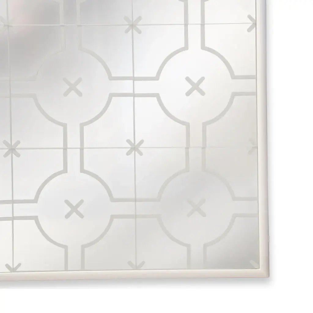 Product Description:Our etched glass mirrors are a stunning addition to your home...as an entrance piece to your foyer or strategically place over your buffet. The geometric mid-century pattern makes this mirror a piece of functional art. No matter where you place this mirror, its sure to be a conversation piece!We hand etched 12.25" thick mirrors. The surrounding frame is solid maple finished in a hand rubbed full gloss white lacquer. The mirror comes with an easy mounting system with a built in level. The mirror can be mounted vertically or horizontally.