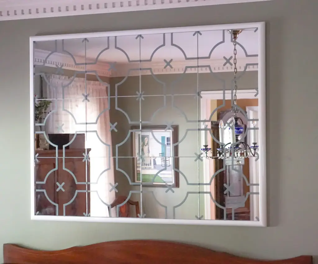 Large Etched Glass Mirror, Geometric Mid Century Art Mirror