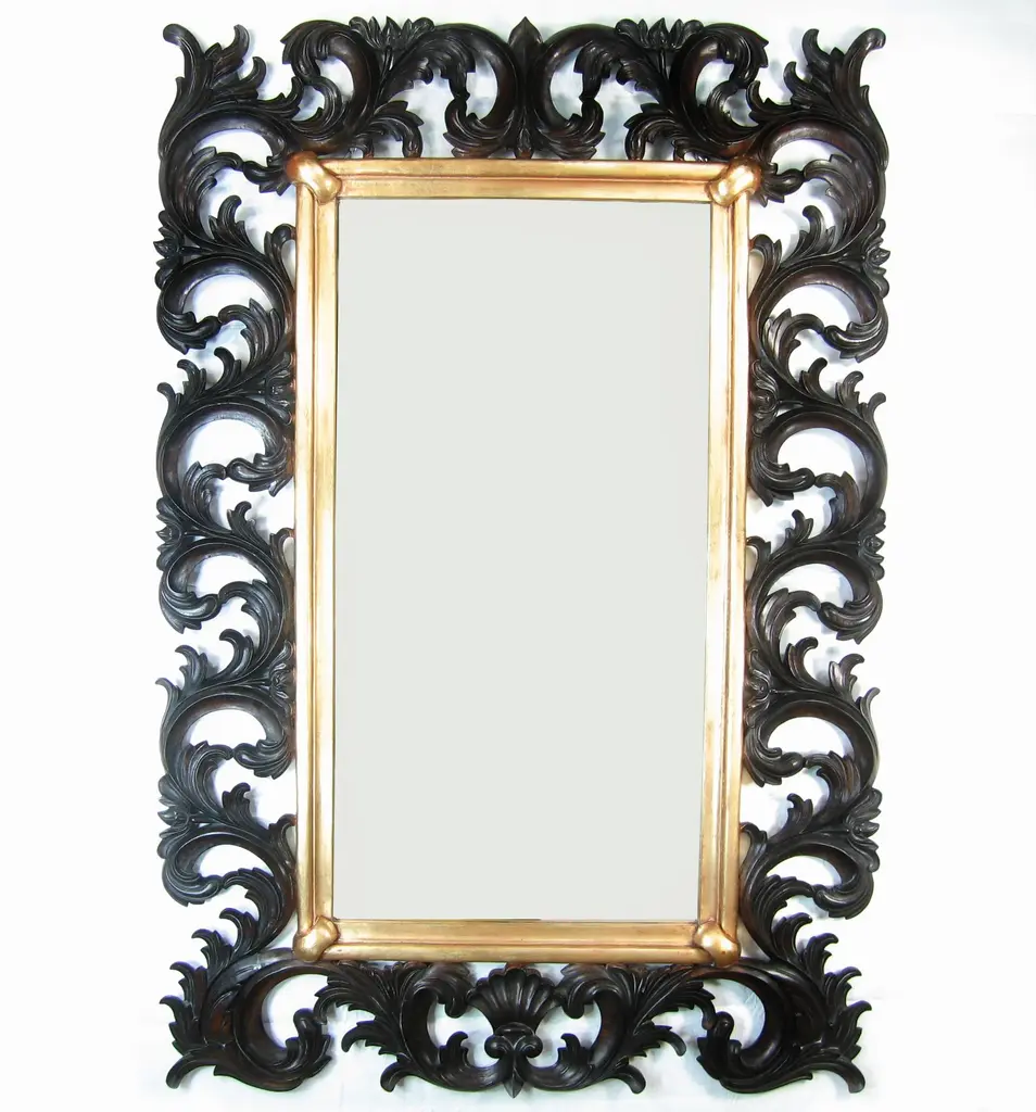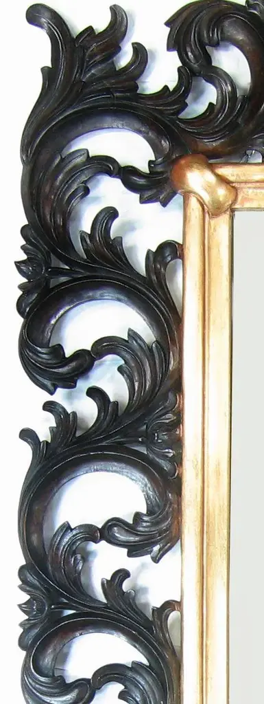 Giant solid wood carved mirror with beautifully carved scrolled leaves details. Center mirror is beveled and is framed with gold leafed wood. At 4 ft wide X almost 6 feet tall this is a unique handcrafted mirror that is not easily seen. it is sure to add a dramatic flair to any hall or entry way.