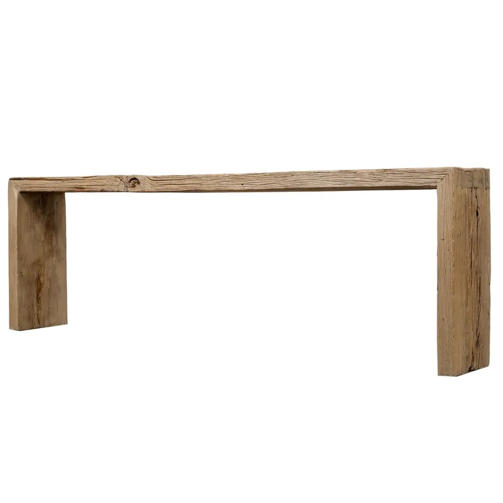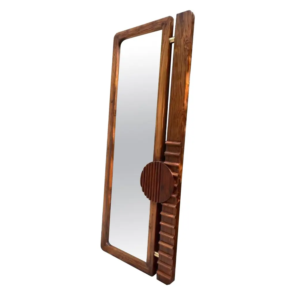 Rustic charm meets quaint elegance in this large walnut mirror. Strips of wood created a rugged contrast to the clean, geometric features of the mirrored glass.