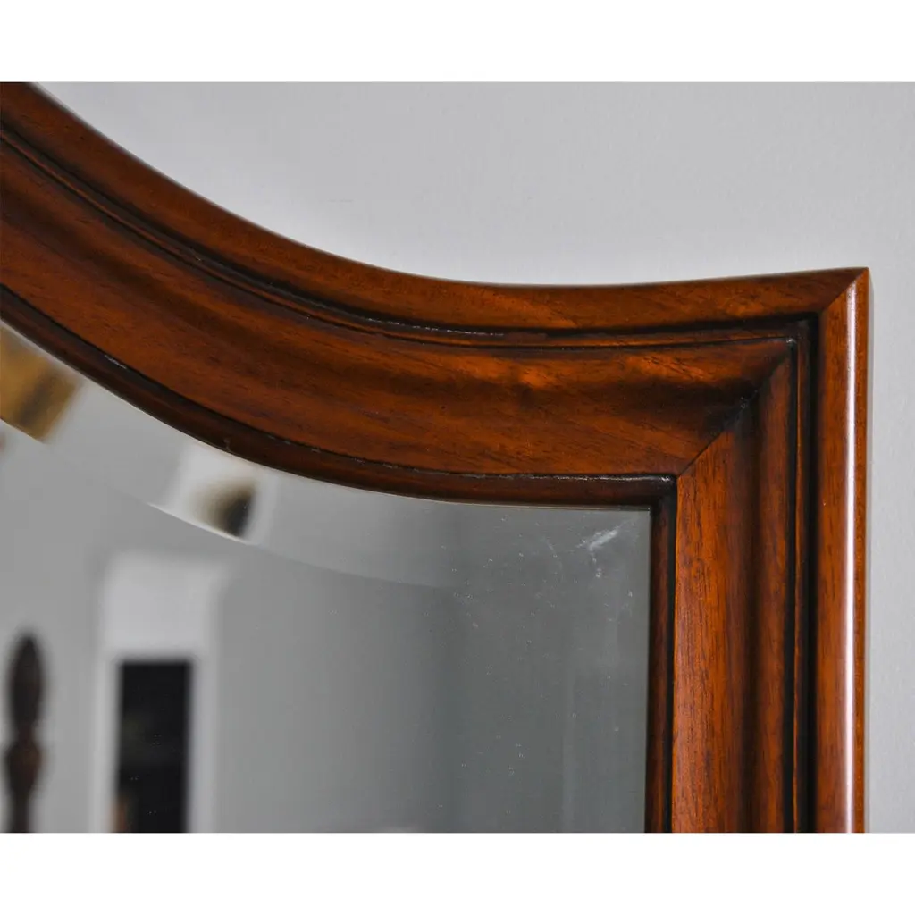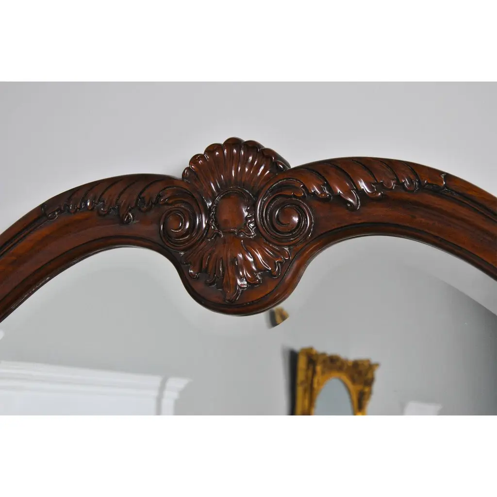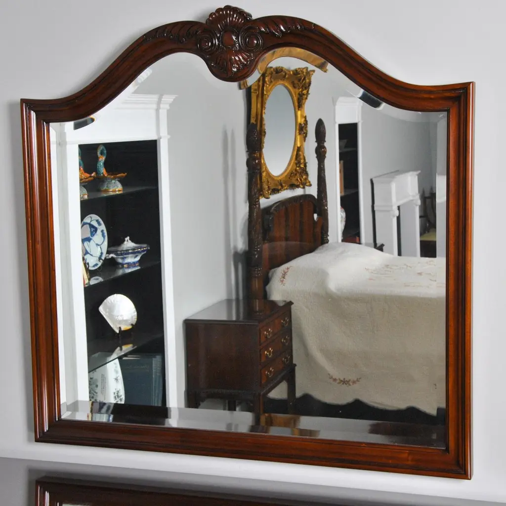 The Large Mahogany Mirror features a solid mahogany frame with a crest of hand carving. This helps discern the mirror from its' mass produced counter parts found elsewhere. Thick, great quality bevelled glass is used inside the frame and the Large Mahogany Mirror ships out ready to hang in the home. This mirror looks great over top of many of our chests of drawers. Measures 47?w x 2?d x 45?h metric 119 5 114.