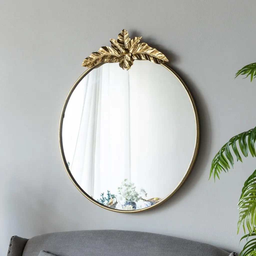 Infuse your space with elegance using this large round wall mirror, designed with a bold metal frame and intricate leaf-like adornments. Its traditional style adds a touch of timeless sophistication to any room. Crafted for durability, this mirror offers a reliable accent piece that will last for years. Perfect for complementing a wide range of interior styles, it enhances the beauty and functionality of your decor. 36" x 41"